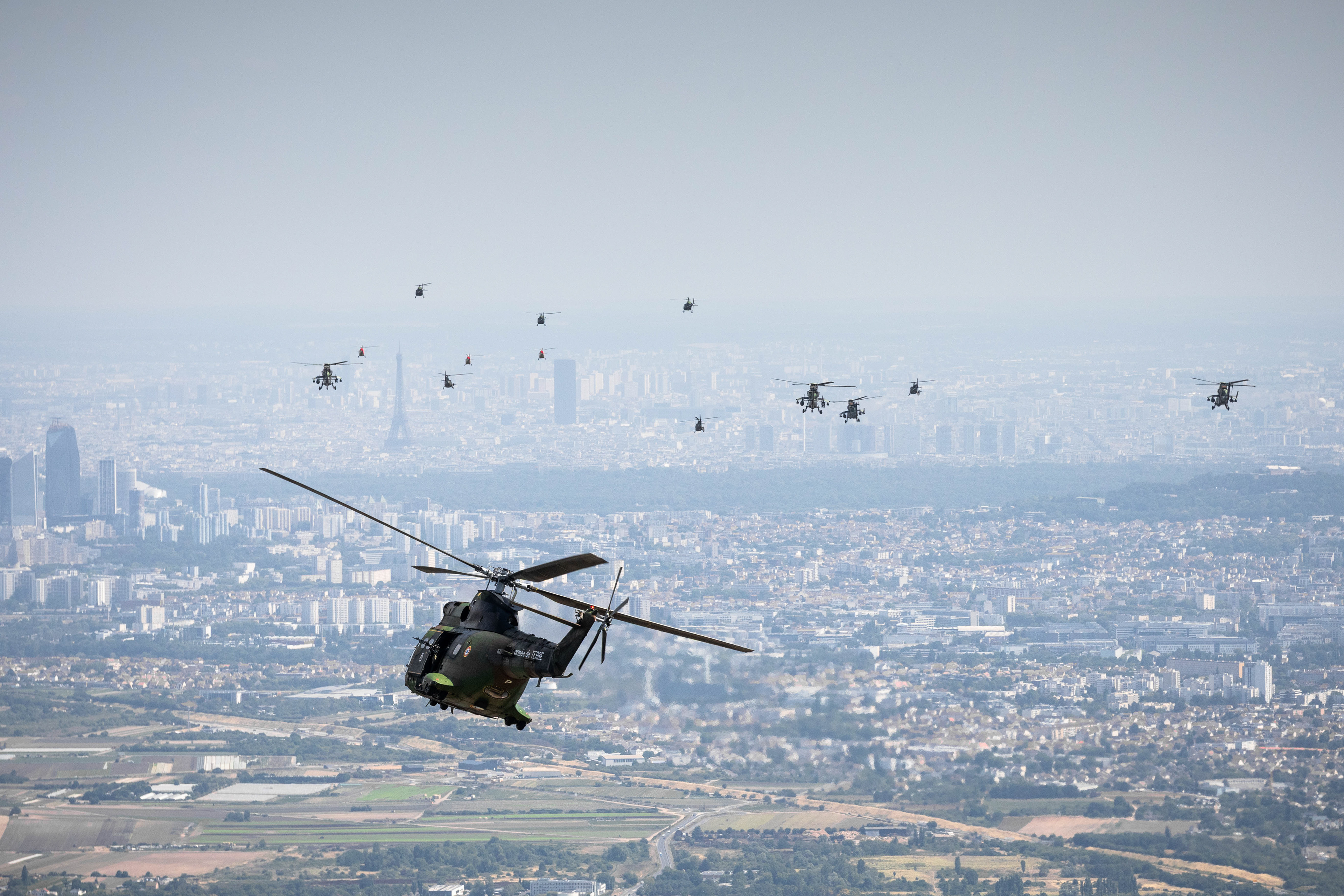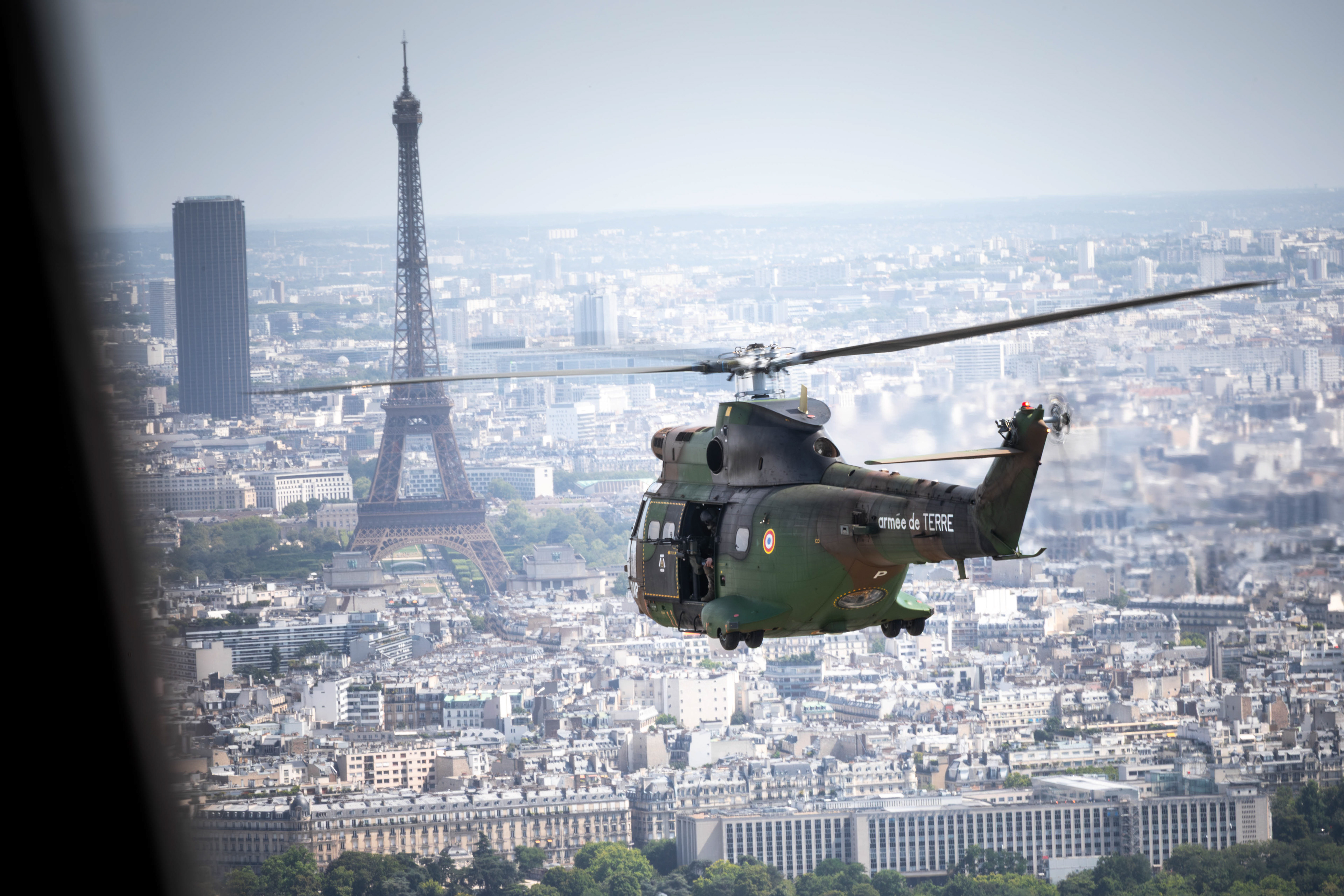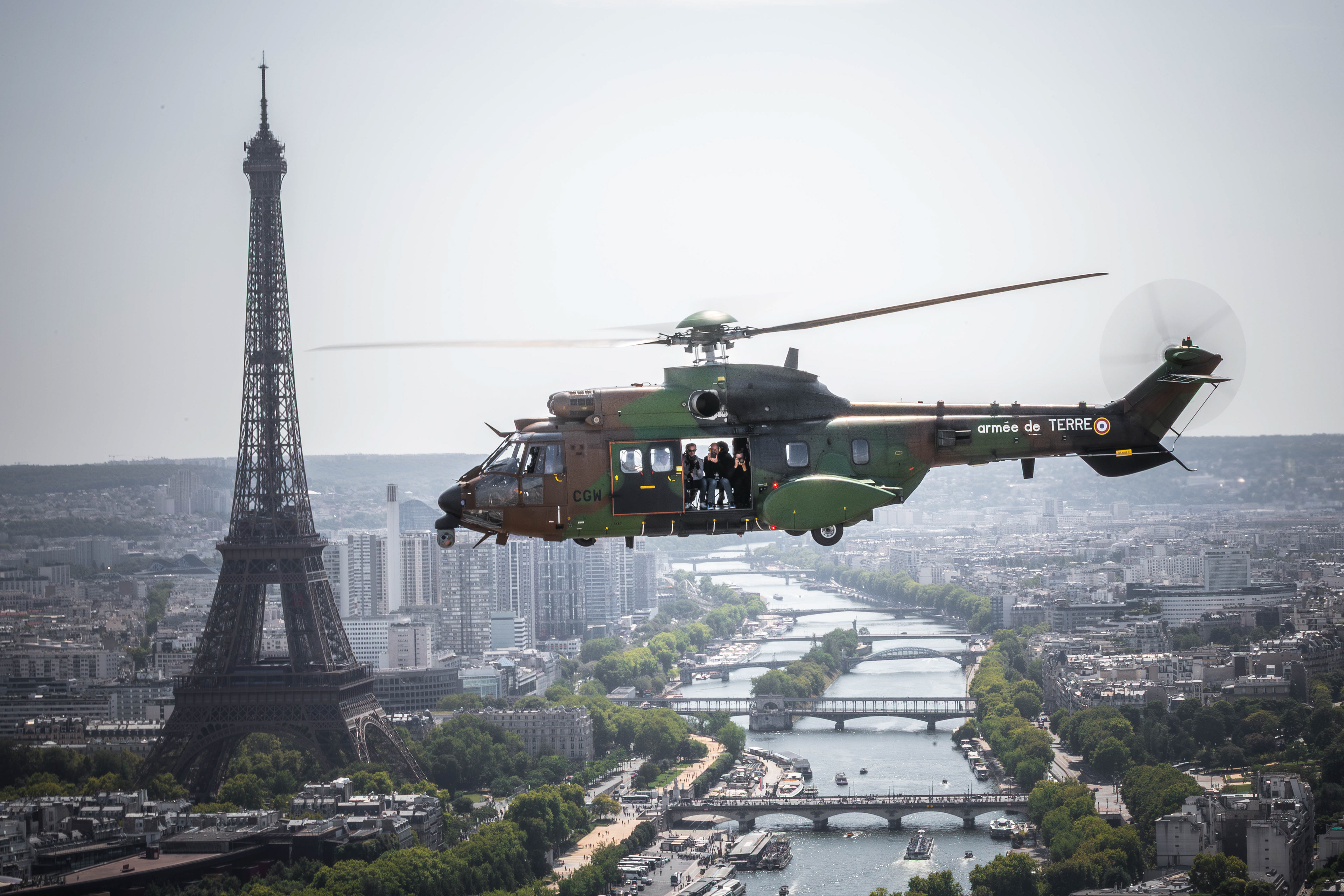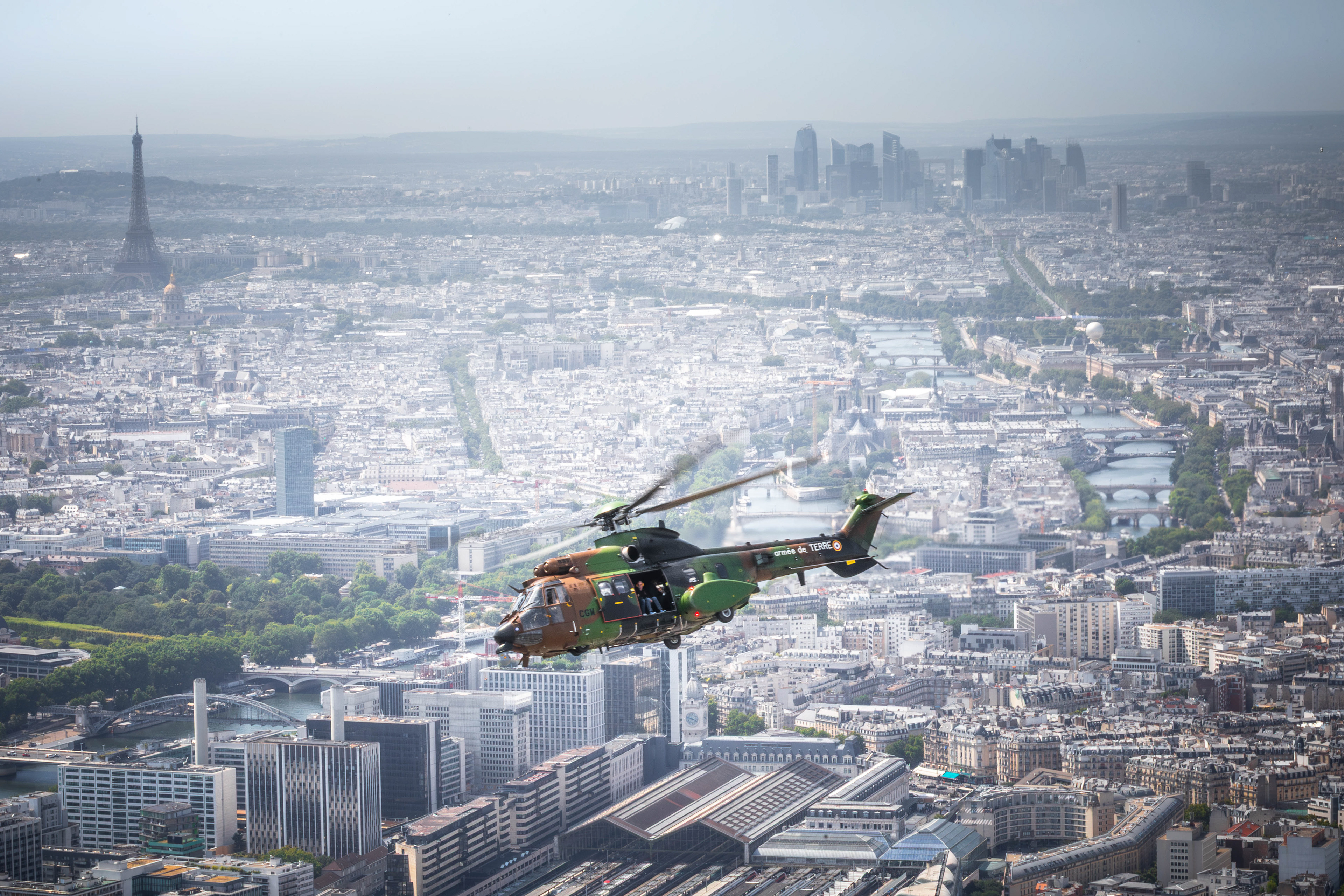 À 15h45, le top est donné et l'ALAT est en route vers La Défense. Les hélicoptères se mettent en descente vers une altitude de 400 pieds, soit environ 150 mètres. Les vitesses sont ajustées, et les formations resserrées. Les hauts immeubles de La Défense défilent sous nos pieds pendant que nous sommes concentré sur les prises de vues inédites à réaliser du Puma avec la Tour Eiffel derrière, ou encore le Cougar avec les Invalides en arrière plan. En un rien de temps, nous auront survolé l’Arc de Triomphe, le Louvre, puis Notre-Dame avant d'entamer un virage à droite vers Villacoublay.