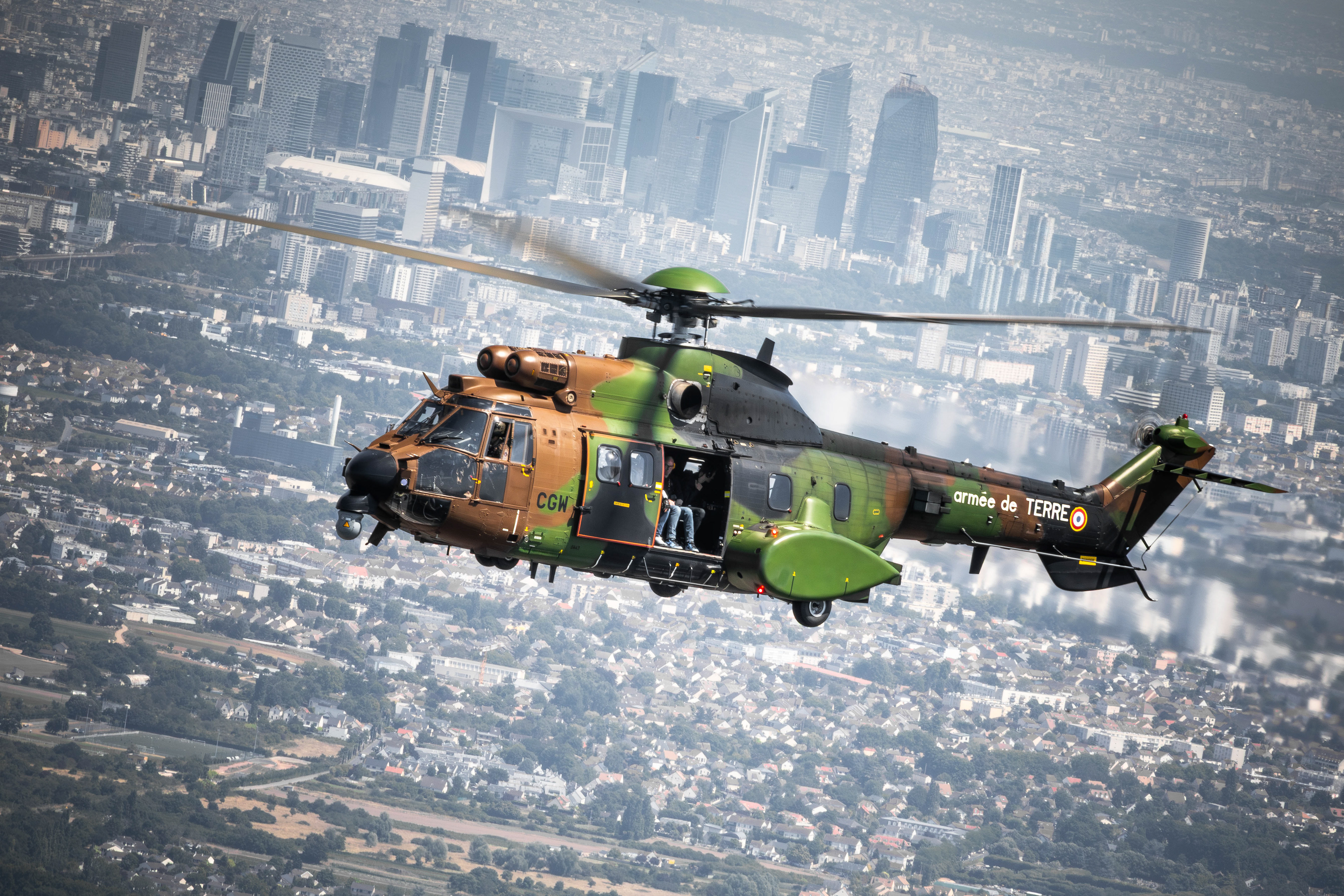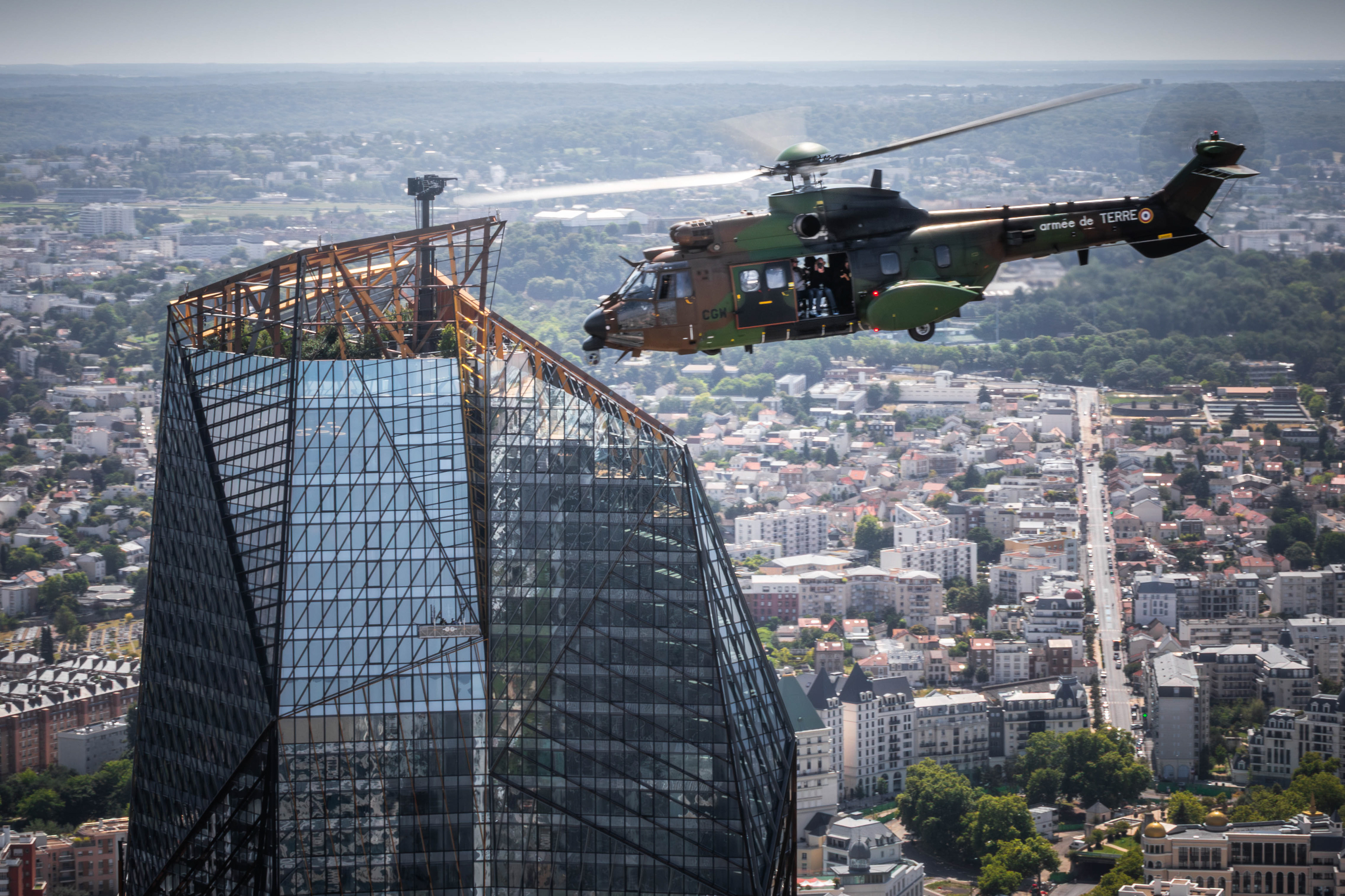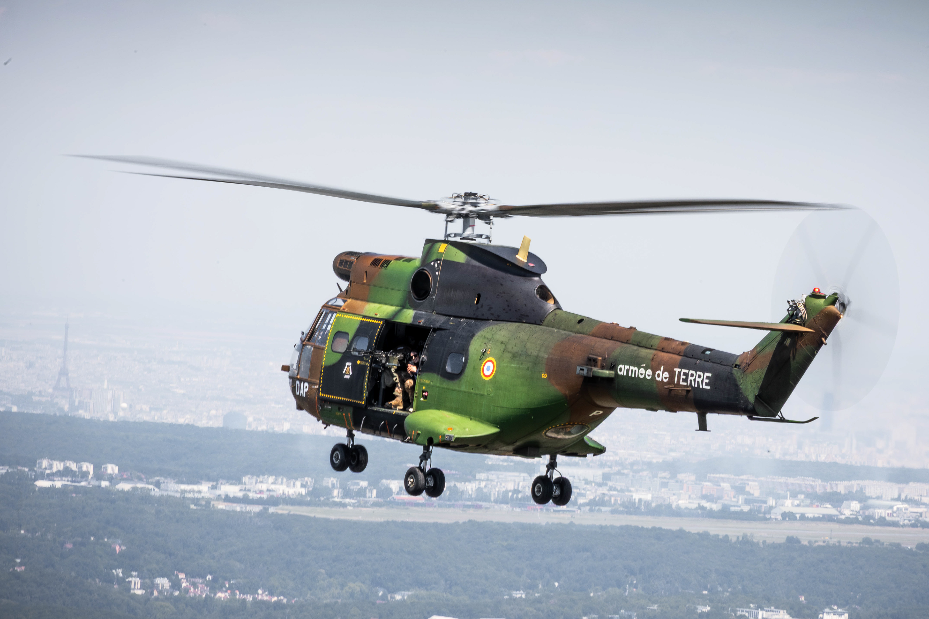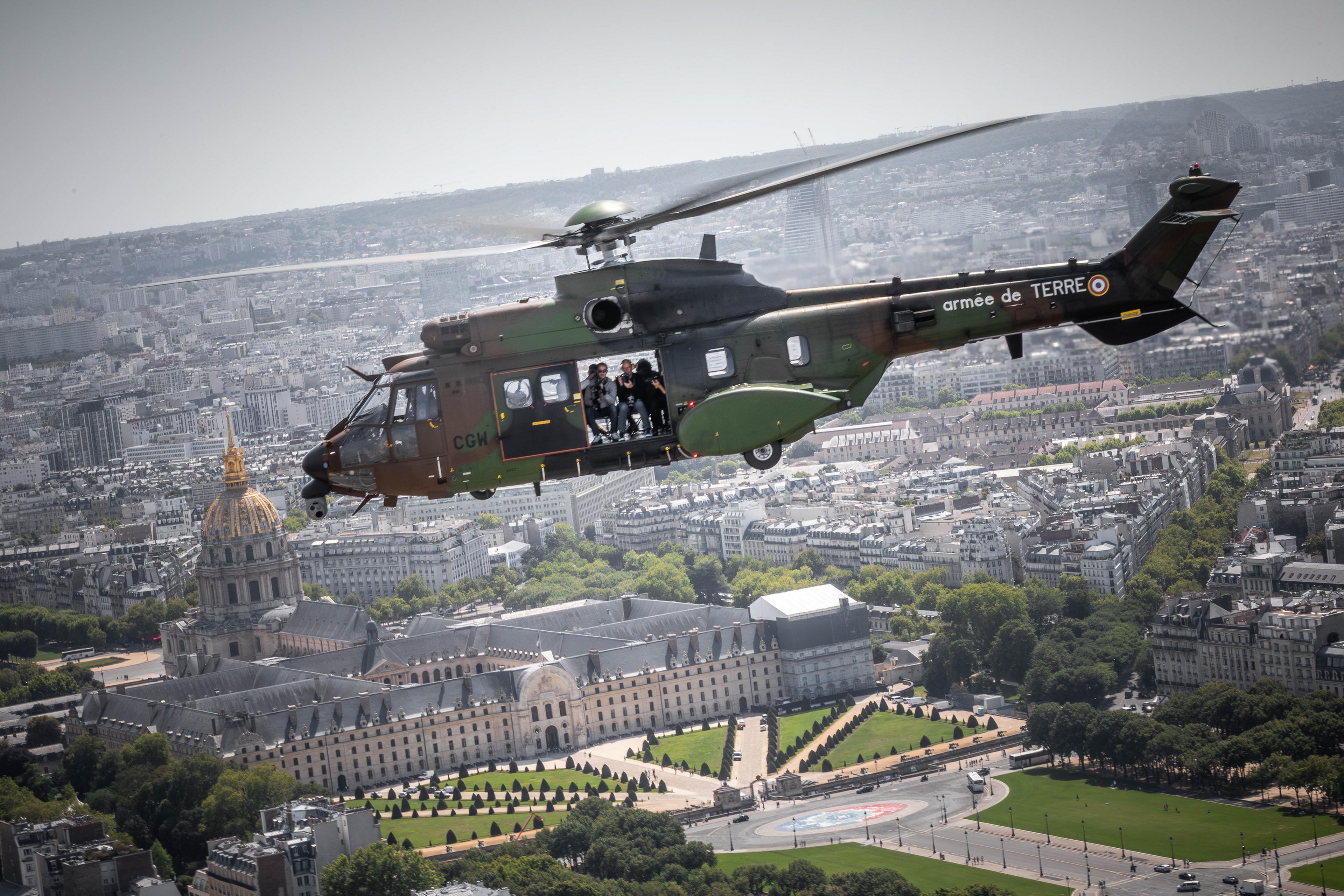 À 15h45, le top est donné et l'ALAT est en route vers La Défense. Les hélicoptères se mettent en descente vers une altitude de 400 pieds, soit environ 150 mètres. Les vitesses sont ajustées, et les formations resserrées. Les hauts immeubles de La Défense défilent sous nos pieds pendant que nous sommes concentré sur les prises de vues inédites à réaliser du Puma avec la Tour Eiffel derrière, ou encore le Cougar avec les Invalides en arrière plan. En un rien de temps, nous auront survolé l’Arc de Triomphe, le Louvre, puis Notre-Dame avant d'entamer un virage à droite vers Villacoublay.