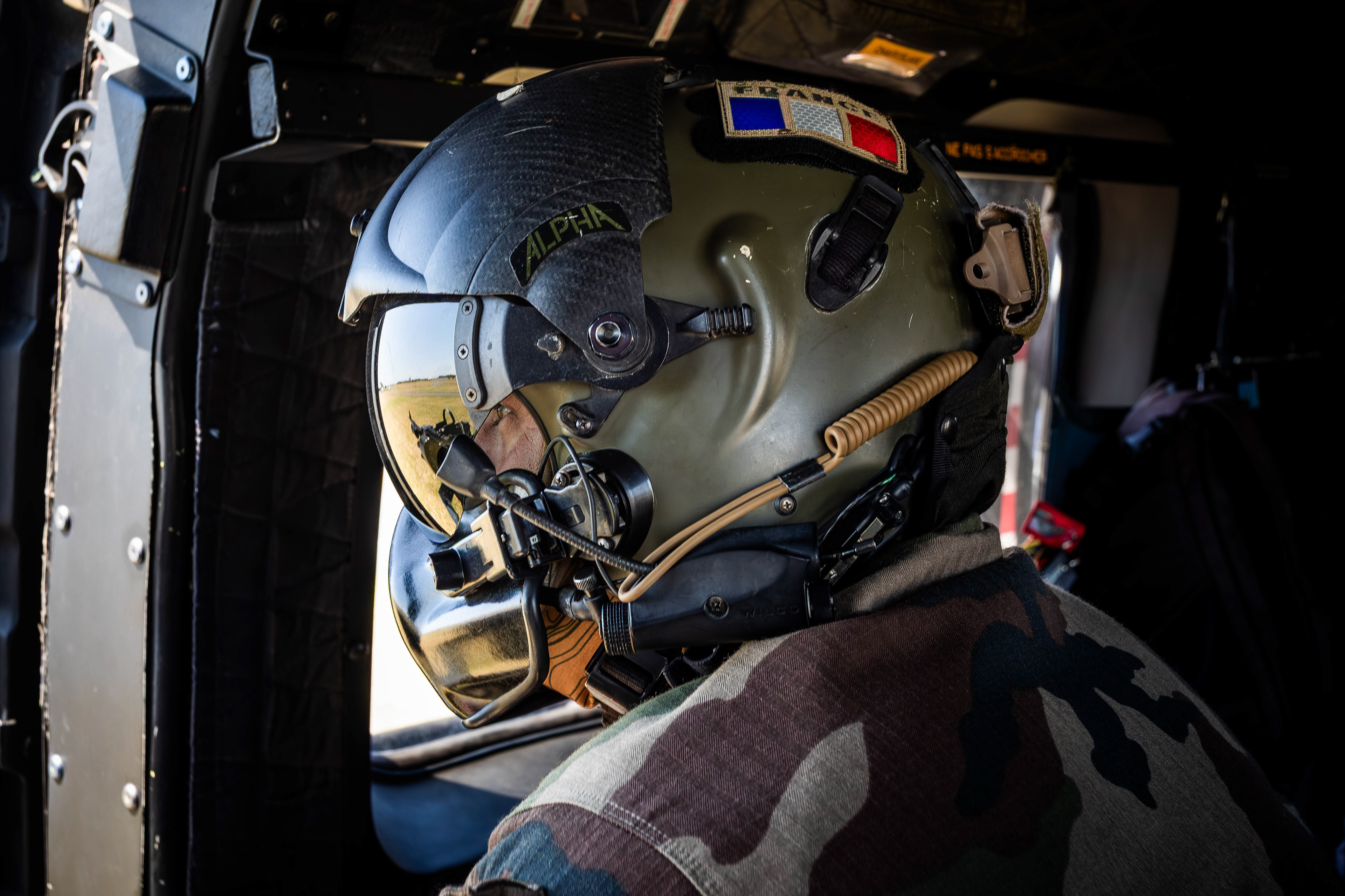 Une fois quelques prises de vues et interviews réalisées, ainsi le briefing de sécurité par le Caporal-Chef Thibaut et la présentation de notre monture du jour par le lieutenant Mathis effectués, c'est l'heure d'embarquer à bord du Cougar F-MCGO, modernisé au standard AS332M1 appartenant au 5e Régiment d’Hélicoptères de Combat. Basé à Pau, il fait parti de la 4e brigade d'aérocombat. Doté d’une flotte moderne composée de Gazelles, Cougars, Tigres et NH90 Caïman, ce régiment incarne l’excellence opérationnelle et la réactivité. Engagé sur de nombreux théâtres d’opérations extérieures – du Sahel au Levant – le 5e RHC se distingue par sa capacité à appuyer les forces conventionnelles au sol dans les conditions les plus exigeantes. Au cœur des interventions interarmées, il incarne le savoir-faire tactique et technologique de l’armée française. En l'occurrence, notre machine bénéficie d’améliorations notables : réservoirs de carburant agrandis, caméra FLIR ADS350 en proue, et un cockpit entièrement digitalisé.