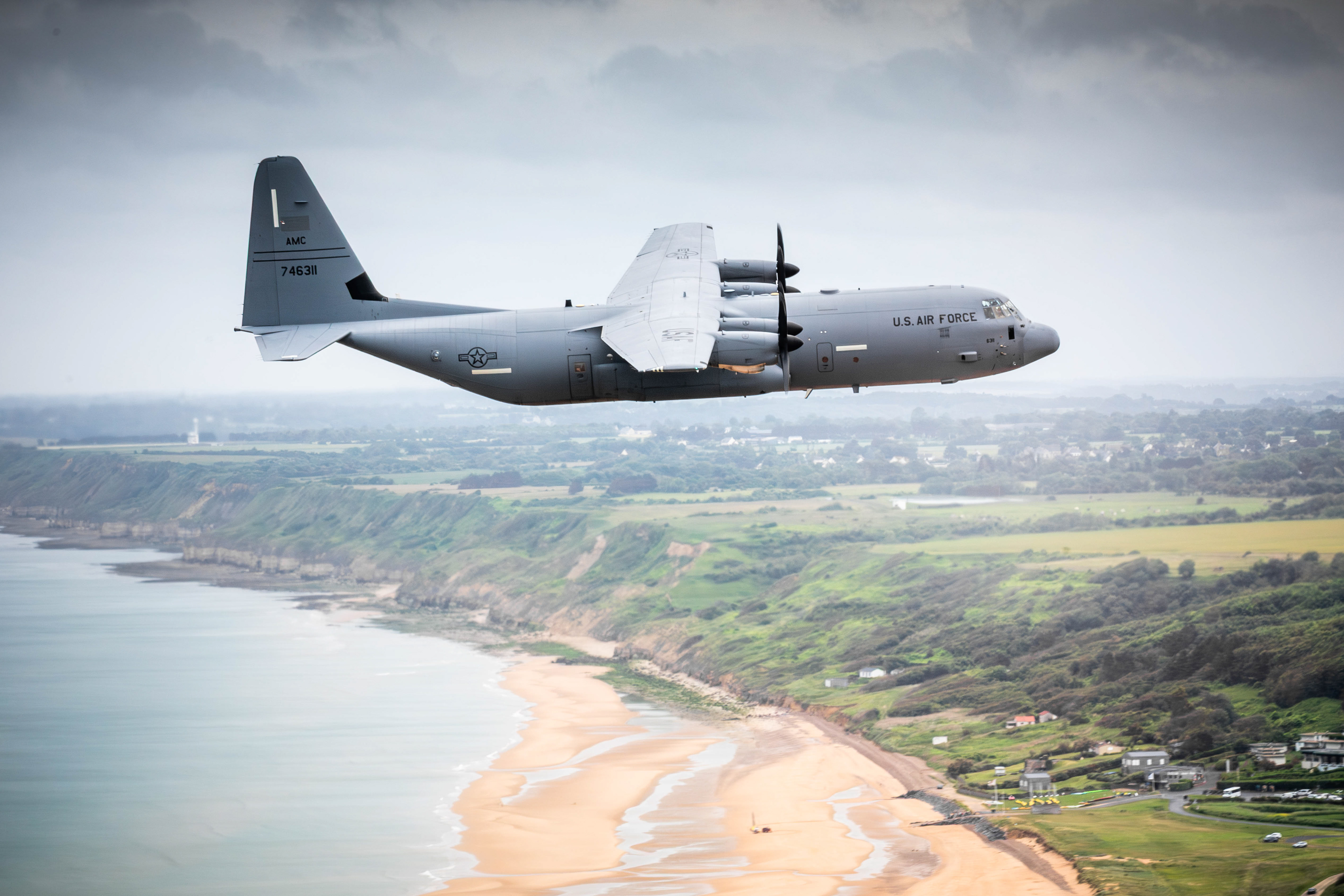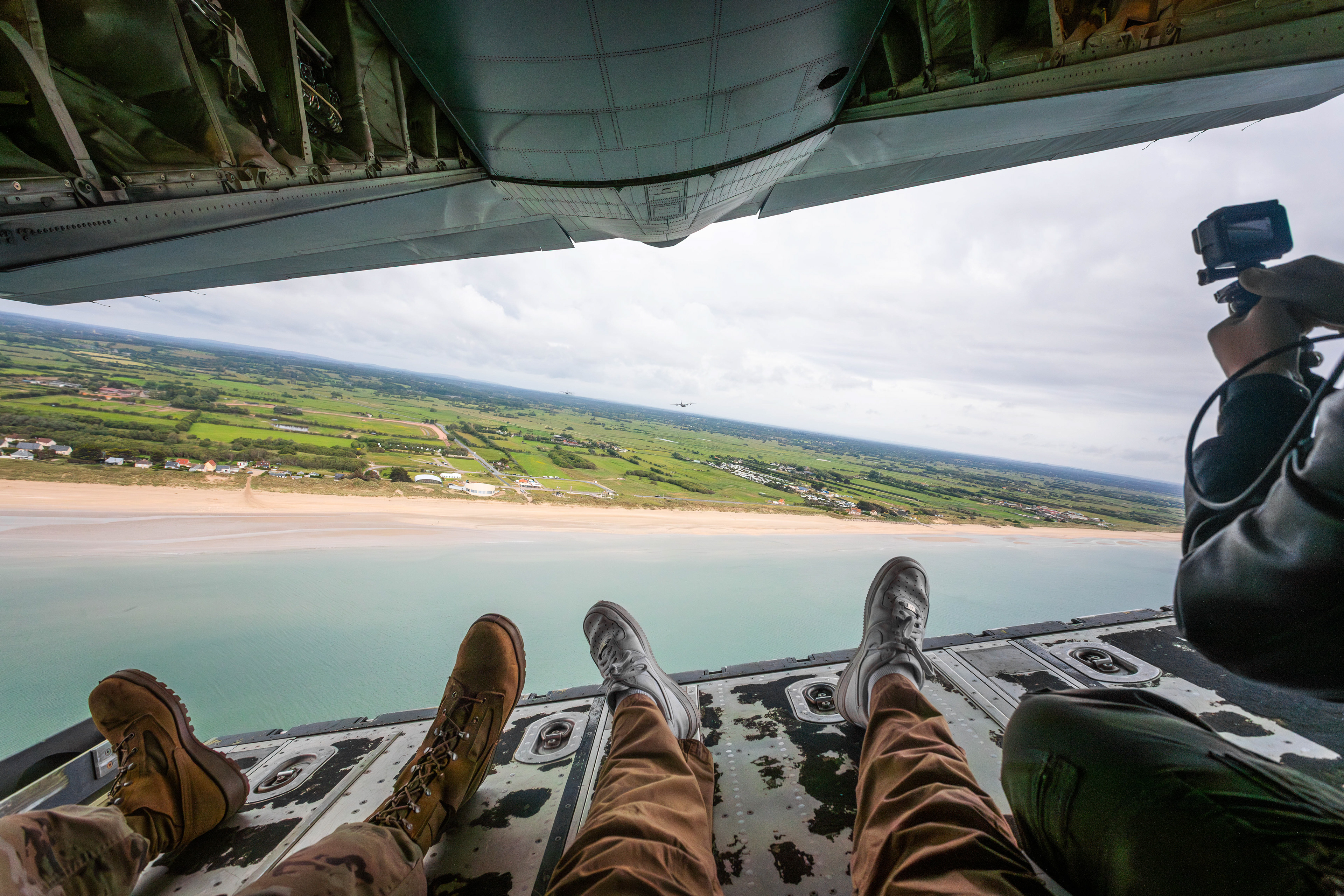 Nous sommes positionnés à l'arrière droit du leader, avec 2 C-130J USAF sur notre gauche et un C-130H néerlandais arrière gauche. À bord, calme professionnel, l’ambiance est feutrée, presque solennelle. La campagne normande s’ouvre sous nos ailes dans une météo brumeuse. La formation se resserre en losange au-dessus des plages de la côte nord de Caen : Arromanches-les-Bains, Colleville-sur-Mer, Omaha Beach. Nous glissons au ras du littoral, l’avion parfaitement est stable, le pilotage est millimétré. Vu du sol, les quatre Hercules offrent un spectacle à couper le souffle. Nous pouvons apercevoir le ciel, puis la mer, plus le ciel dans les rares hublots de notre aéronef. Cloués au siège par les 3 ou 4g encaissés toutes les minutes avec les virages bien engagés de nos pilotes, certains commencent déjà à sentir que le sac à vomi sera utile pour les 2h45 de vol restantes...