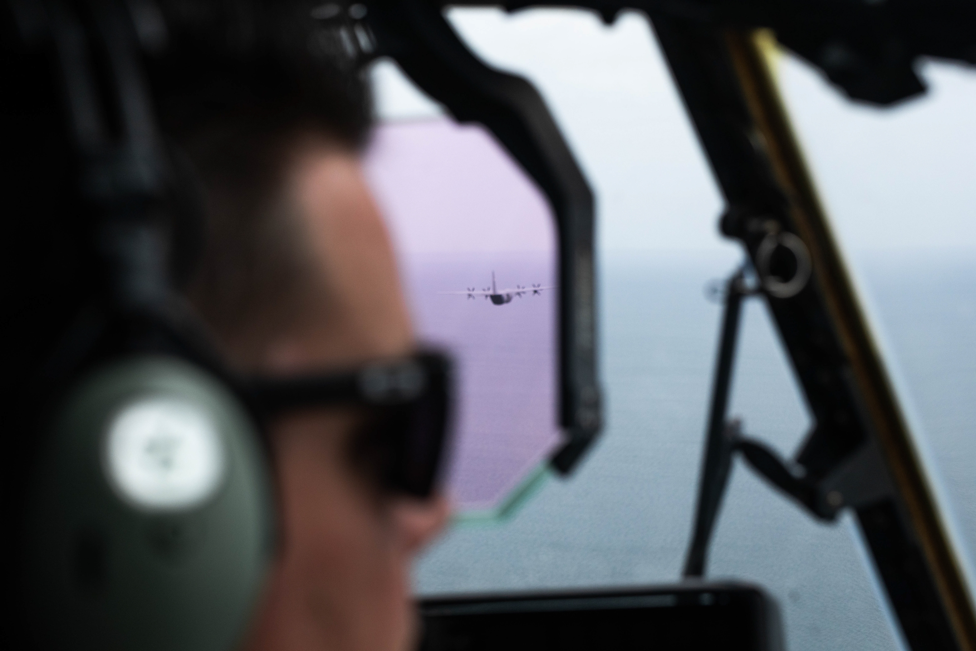 Peu après la verticale de Granville, une loadmaster vient me chercher : “You’re up!” Elle me tend un harnais de sécurité. L’instant est irréel. Quelques instants plus tard, la rampe arrière est abaissée en plein vol, et me voilà assis sur le seuil, flanqué des deux loadmasters, sanglé, les pieds à quelques centimètres du vide. À l’arrière, la soute tangue dans l’air frais (qui n'était vraiment pas de refus à ce moment la) de Normandie. Devant mes yeux, un spectacle aérien : deux quadrimoteurs nous suivent, saccadant le ciel de leur présence massive. Encore un peu loins et timides, ils dansent derrière nous avec quelques secondes de décalage sur nos virages engagés avec un mix de mer, de falaises, de villages côtiers et de campagne en arrière plan. Après un tour par la droite puis par la gauche du célèbre Mont-Saint-Michel, il est temps de prendre la route retour vers vers Cherbourg. Aucun mot ne circule, juste les gestes clairs des loadmasters pour la sécurité. Quelques minutes avant de refermer la soute, voilà que nos acolytes se rapprochent de nous à une distance idéale pour les photos. Le moment est magique : c'est une démonstration d'agilité que nous proposent les pilotes des deux machines enchaînants virages et rejointes.