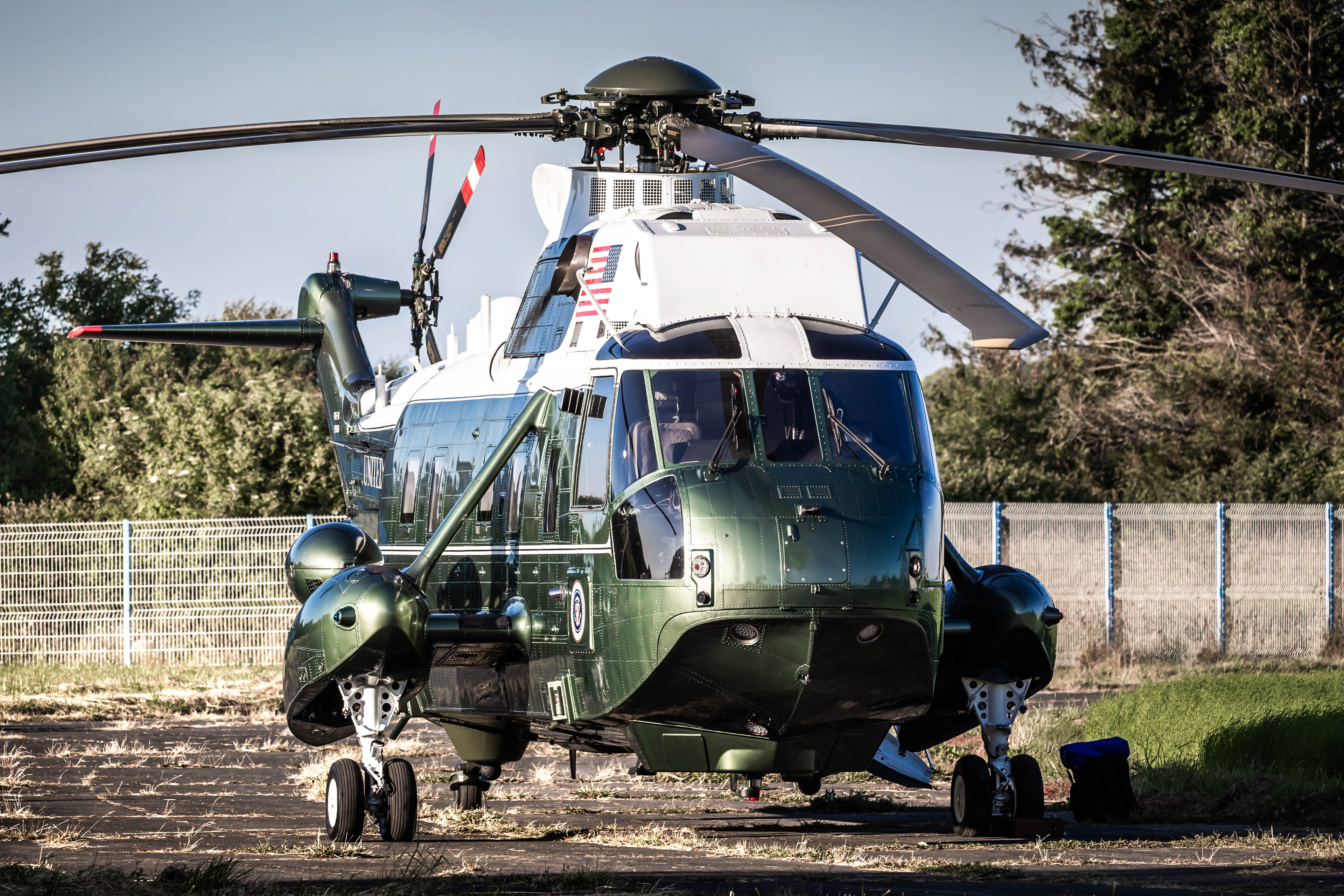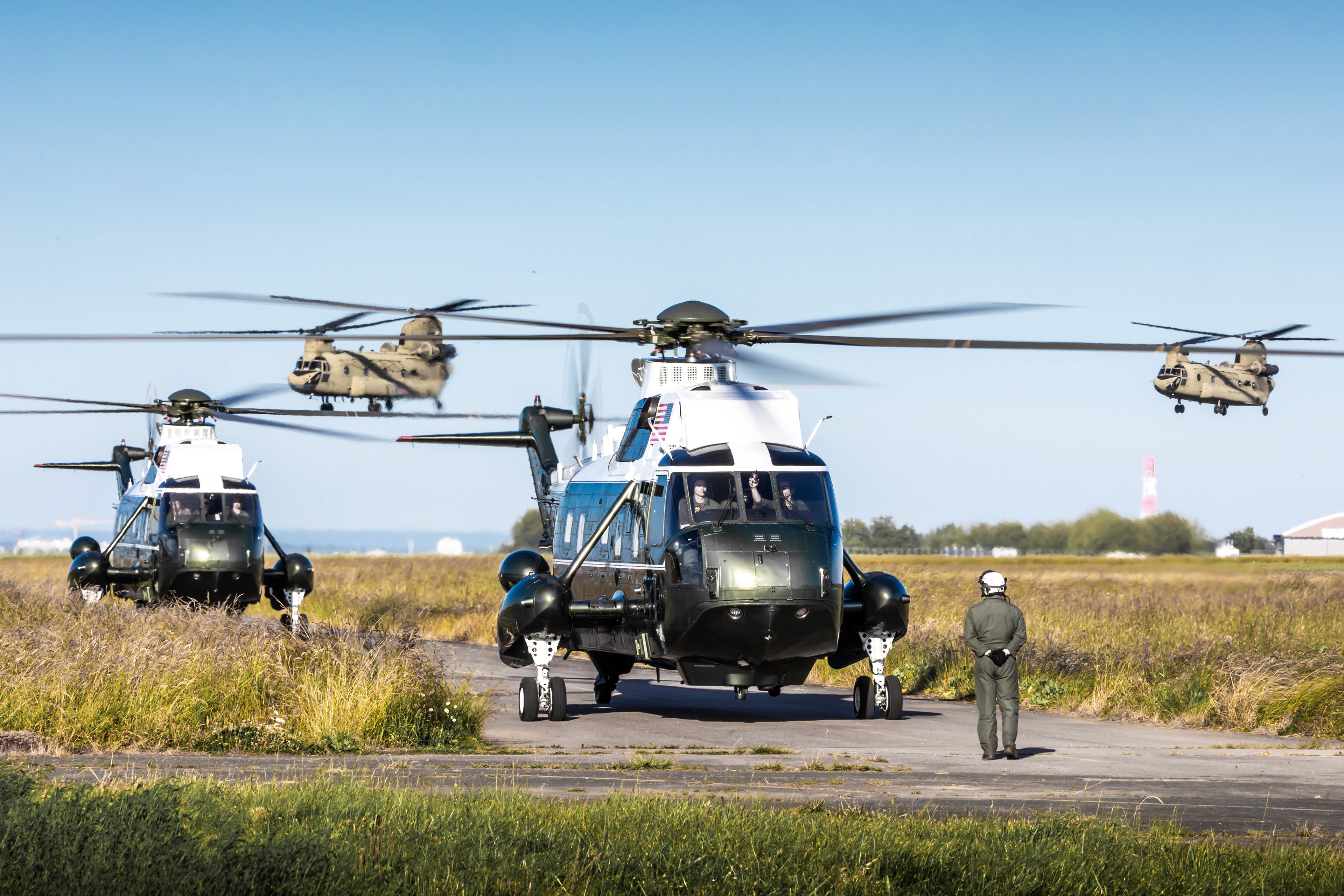 Point d’orgue diplomatique de l’événement, le président des États-Unis, Joe Biden, est arrivé en France le 5 juin à bord de l’Air Force One, un Boeing VC-25A immatriculé 82-8000, atterrissant à Paris-Orly. Après une nuit à l’ambassade, il s’est envolé vers la Normandie le lendemain à bord de Marine One, le célèbre VH-3D Sea King du HMX-1 Presidential Squadron, accompagné de sa flottille de soutien incluant des CH-47F et UH-60 modifiés pour les missions présidentielles. Ces appareils ont été vus successivement à Caen-Carpiquet, Deauville et Cherbourg, selon les étapes du déplacement officiel, témoignant de l’importance logistique et sécuritaire de l’événement.