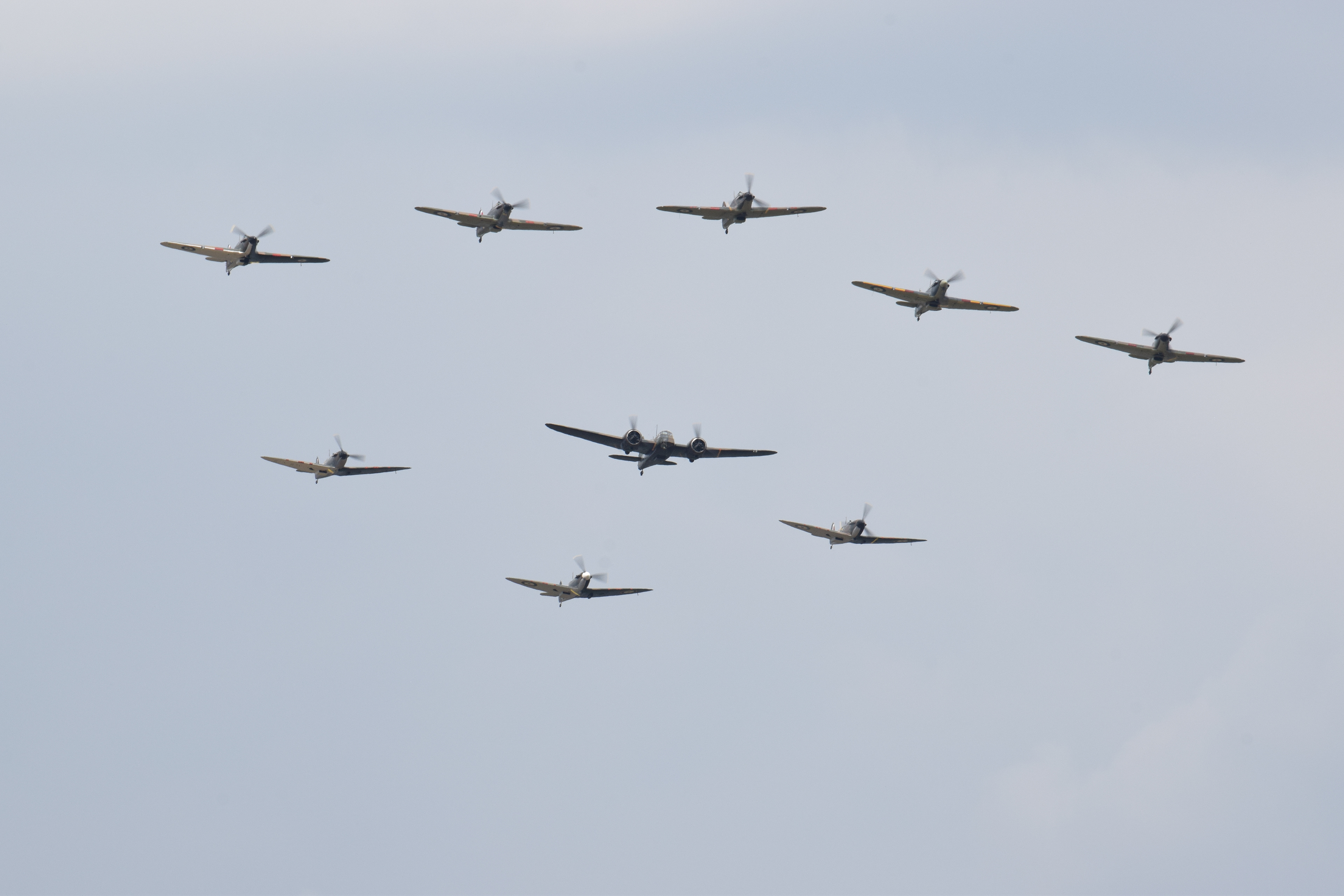 Une reconstitution de combat se joue dans les airs : le HA-112 Buchón entame une poursuite fictive de style dogfight, avec fumée et tension, tandis que la formation Battle of Britain, composée de Blenheim, Hurricanes et Spitfires Mk I, propose un clin d’œil vibrant à 1940.