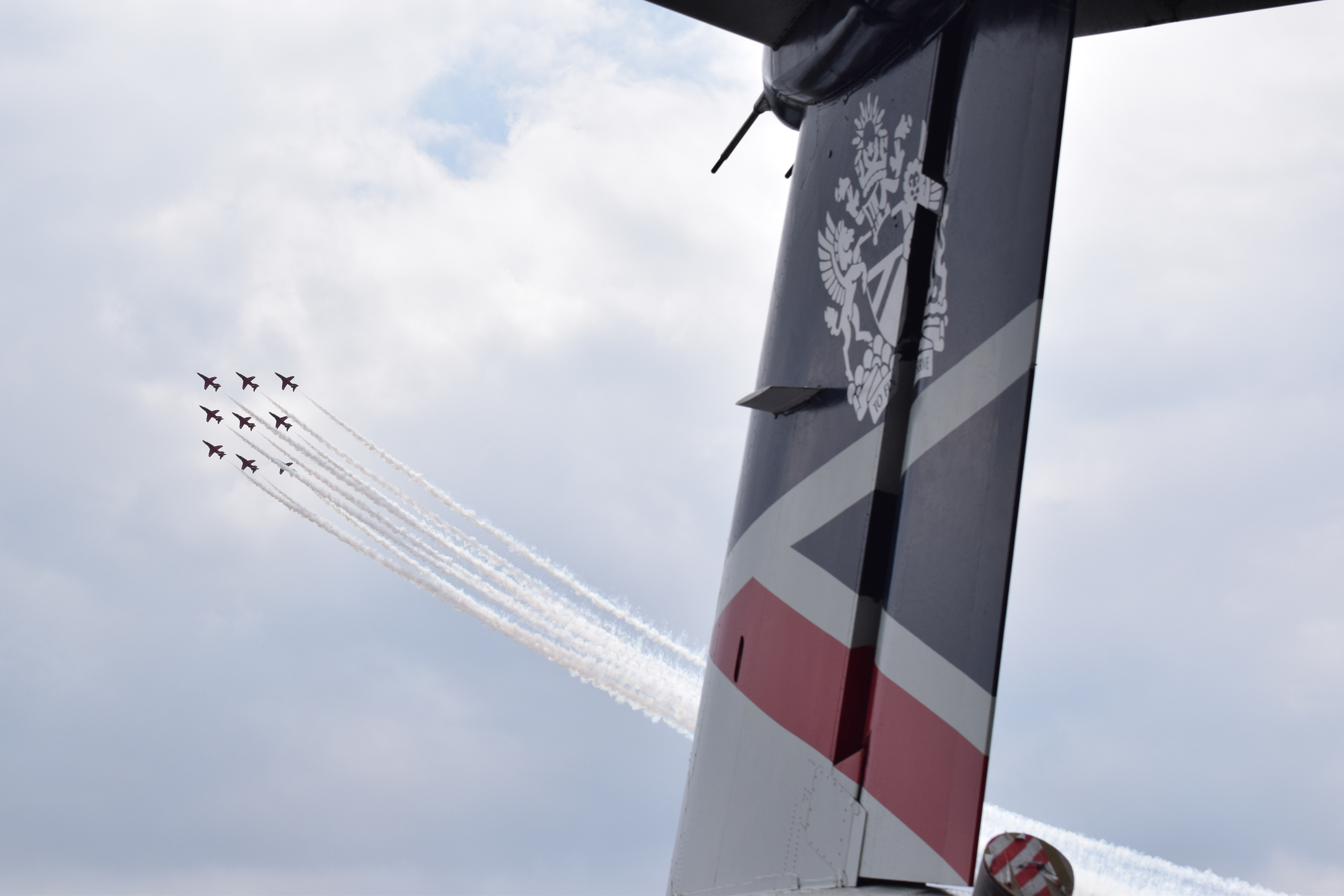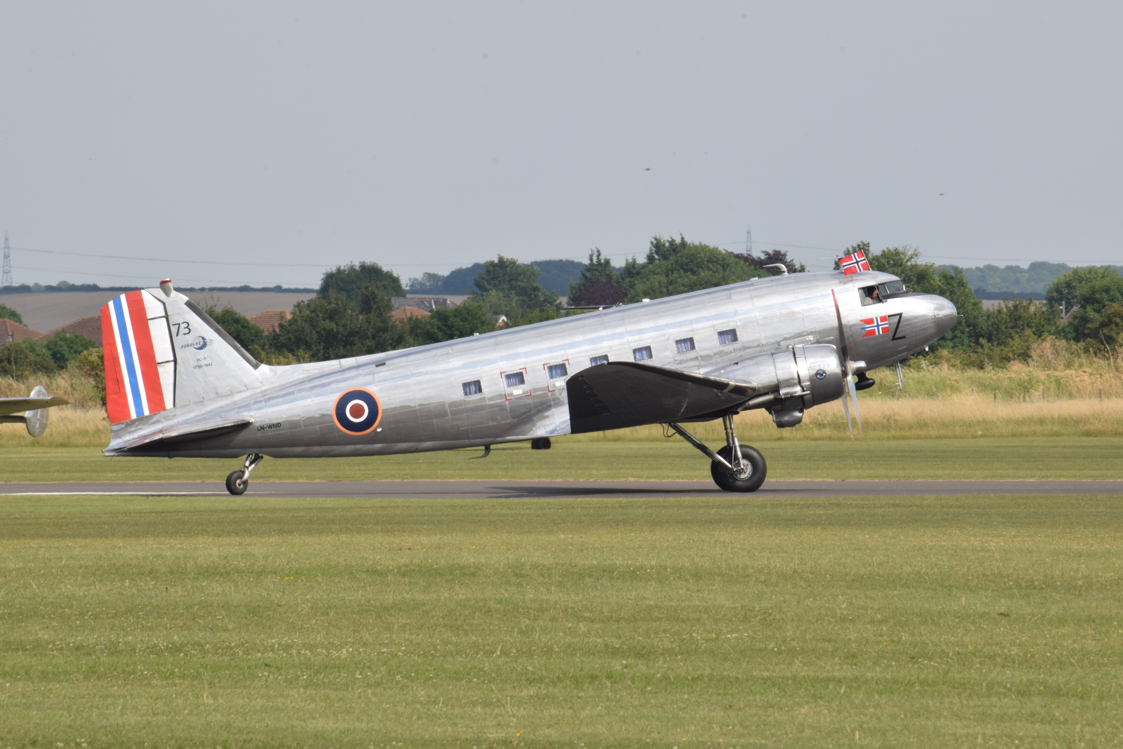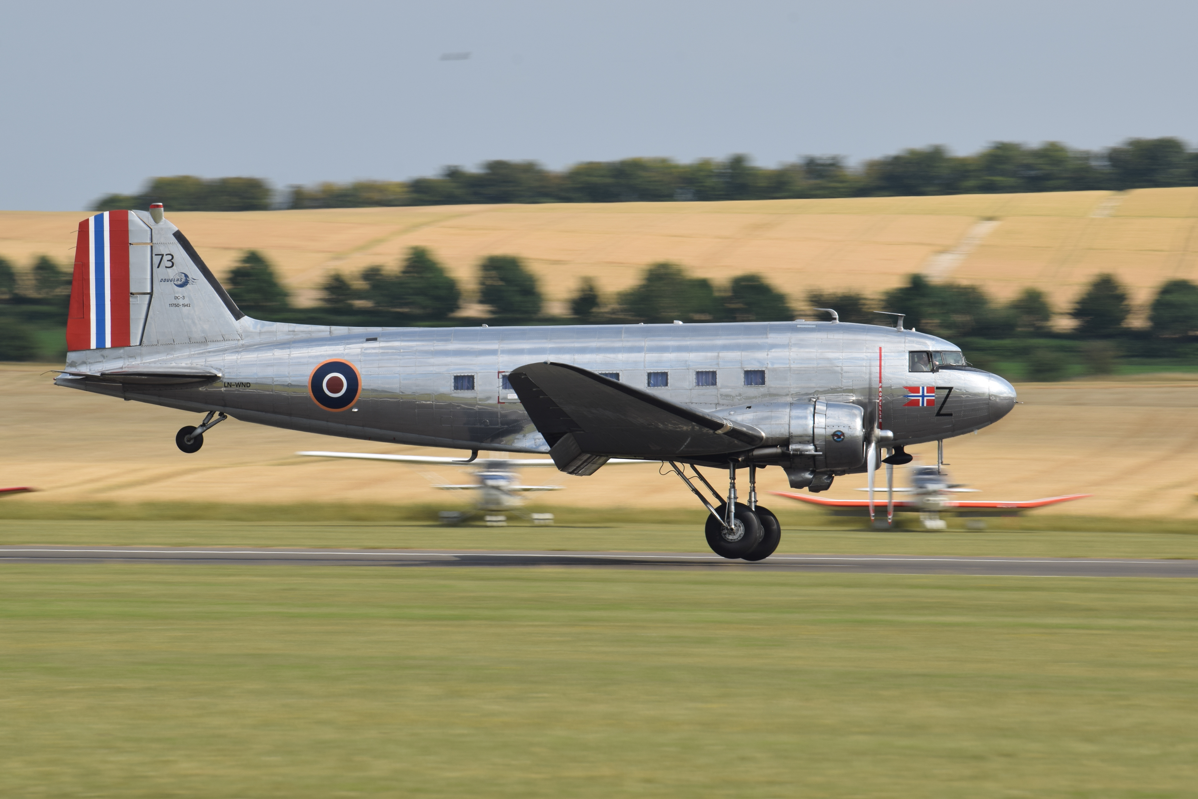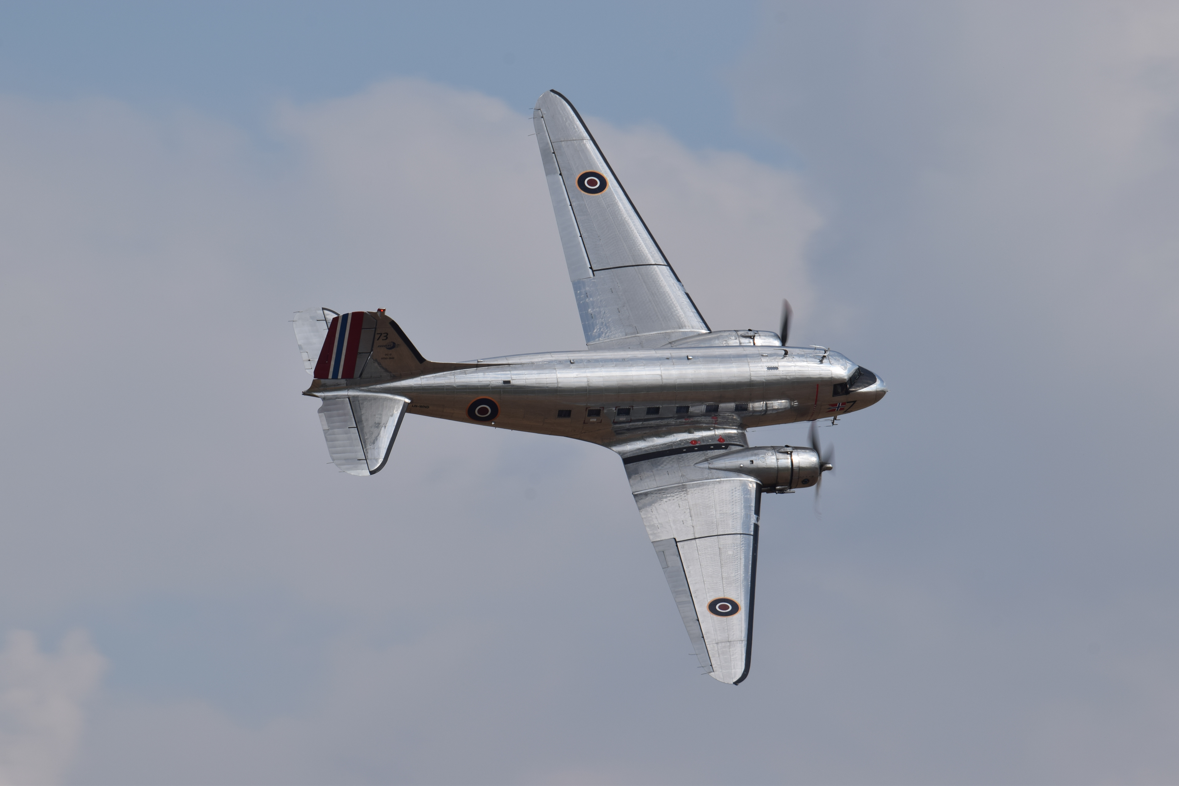 À la suite du Mustang « Shark », un cortège d’avions classiques offre un spectacle contrasté : B-17G "Sally B", escortée par les Mustang dans un hommage historique aux bombardements alliés. Le DC-3 Dakota accompagné de deux Beech 18 forme une formation classique élégante dans la lumière rasante de l’après-midi.