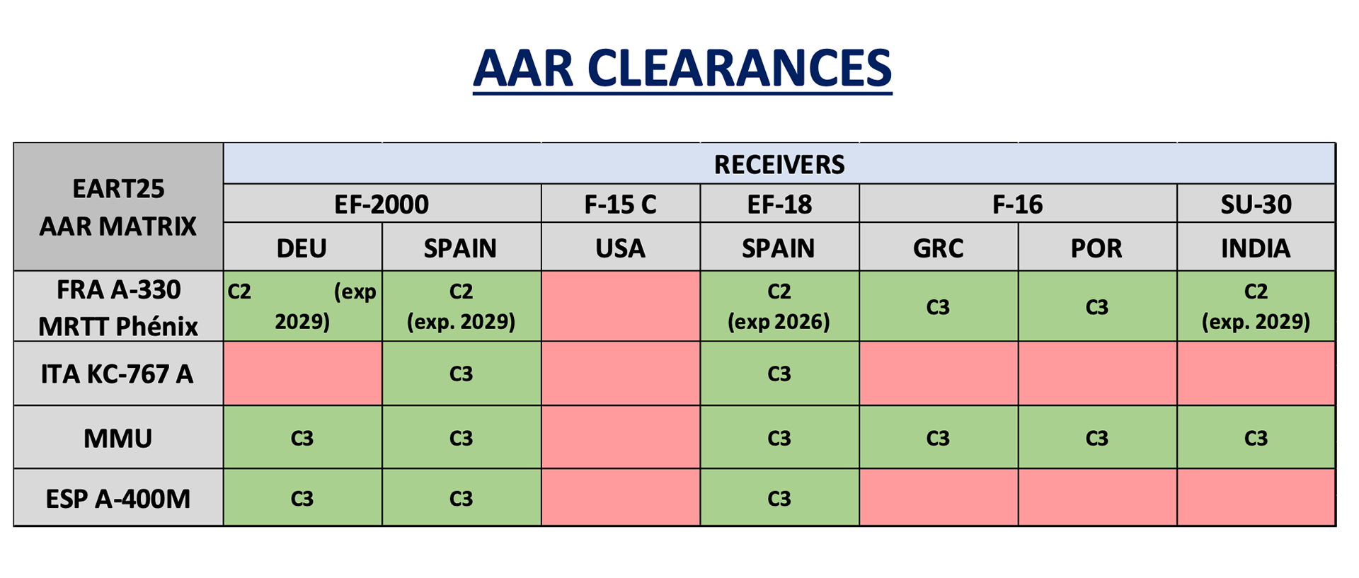 L’EATC dispose d’un large éventail d’actifs de ravitaillement couvrant tout le spectre AAR : de l’hélicoptère aux gros transporteurs, en passant par les chasseurs et bombardiers receveurs. Parmi les caractéristiques : La mise en œuvre de systèmes « boom » et « drogue / probe » (ravitaillement en perche rigide ou souple avec le panier) pour couvrir l’ensemble des récepteurs alliés