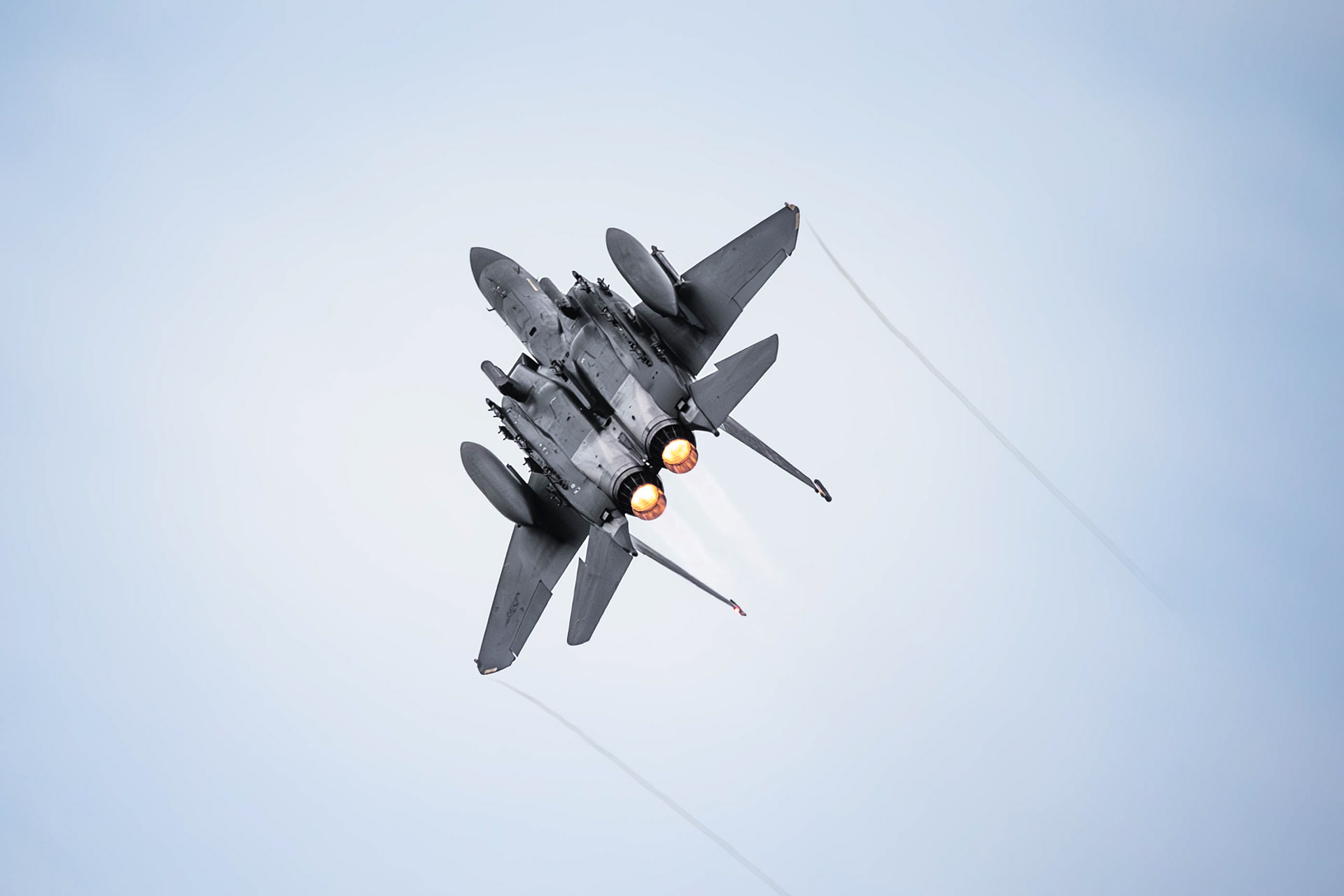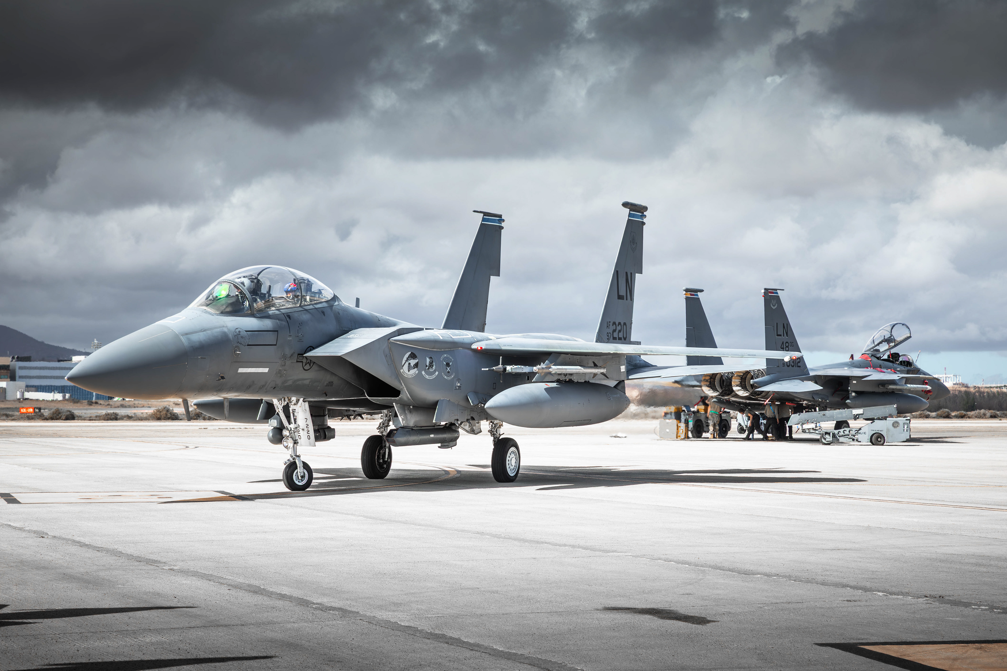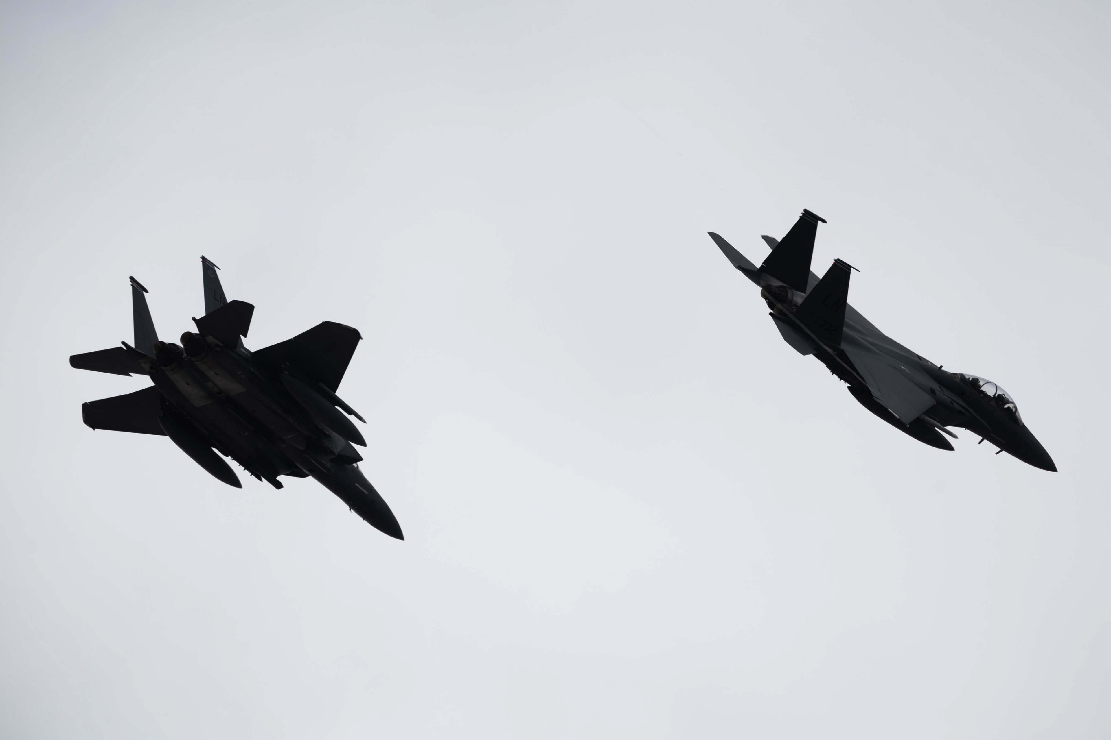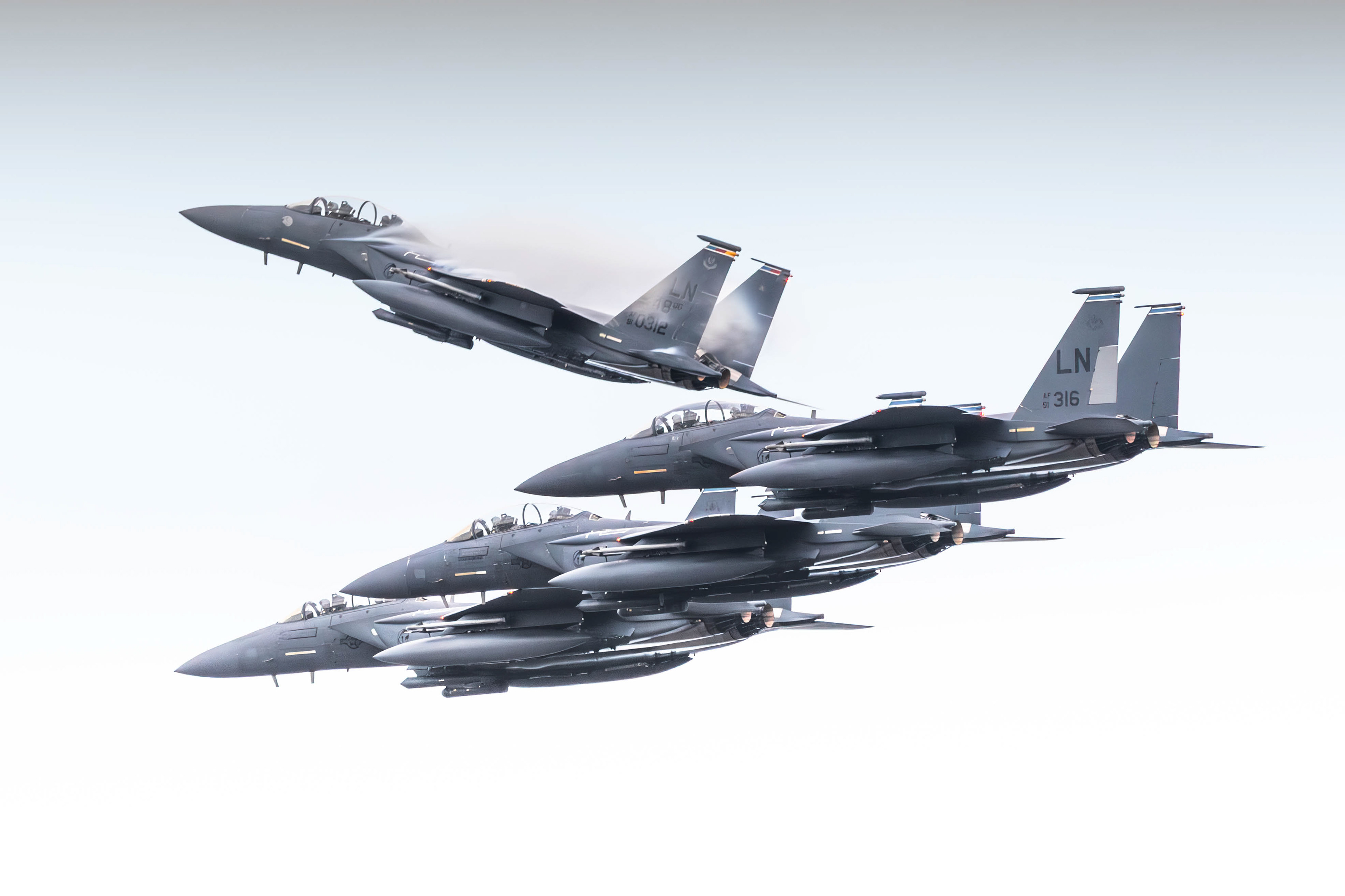 - United States Air Forces in Europe : 14 F-15E Strike Eagle du 48th Fighter Wing basé à RAF Lakenheath, symboles de la puissance aérienne américaine en Europe.