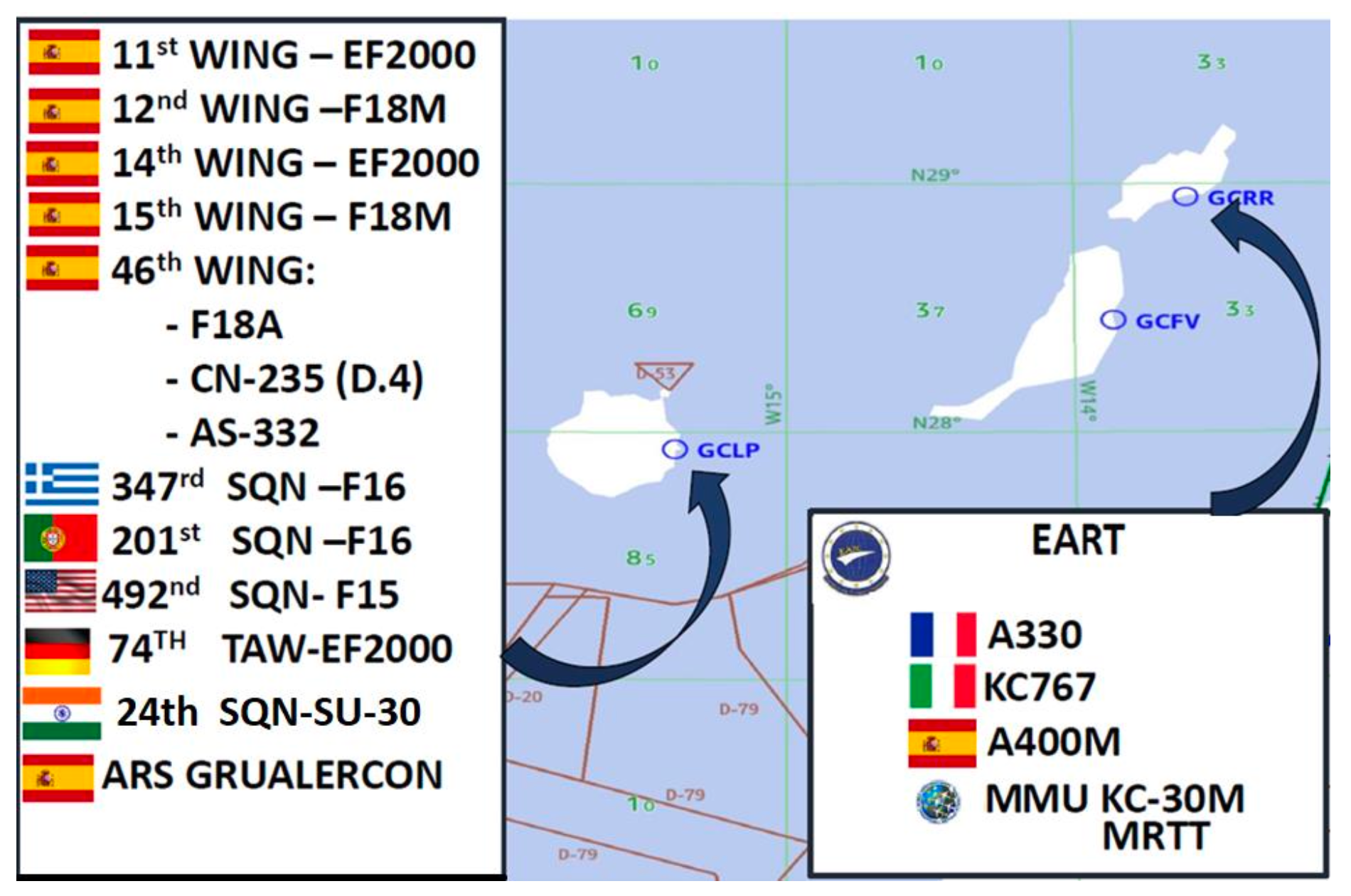 - Ejército del Aire y del Espacio : De nombreux F/A-18M Hornet et Eurofighter Typhoon des Alas 11, 12, 14, 15 et 46, hôtes et pivots tactiques de l’exercice.