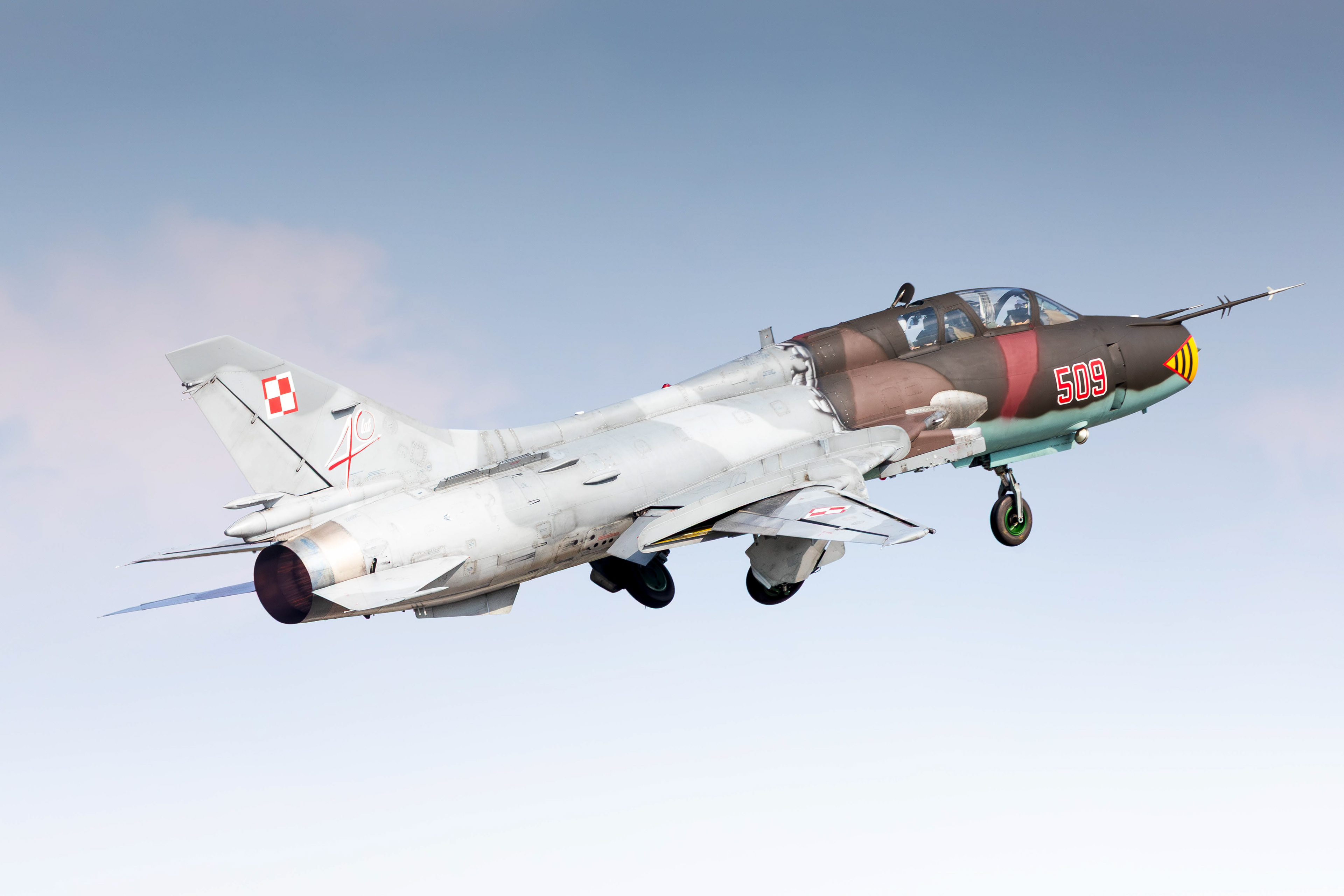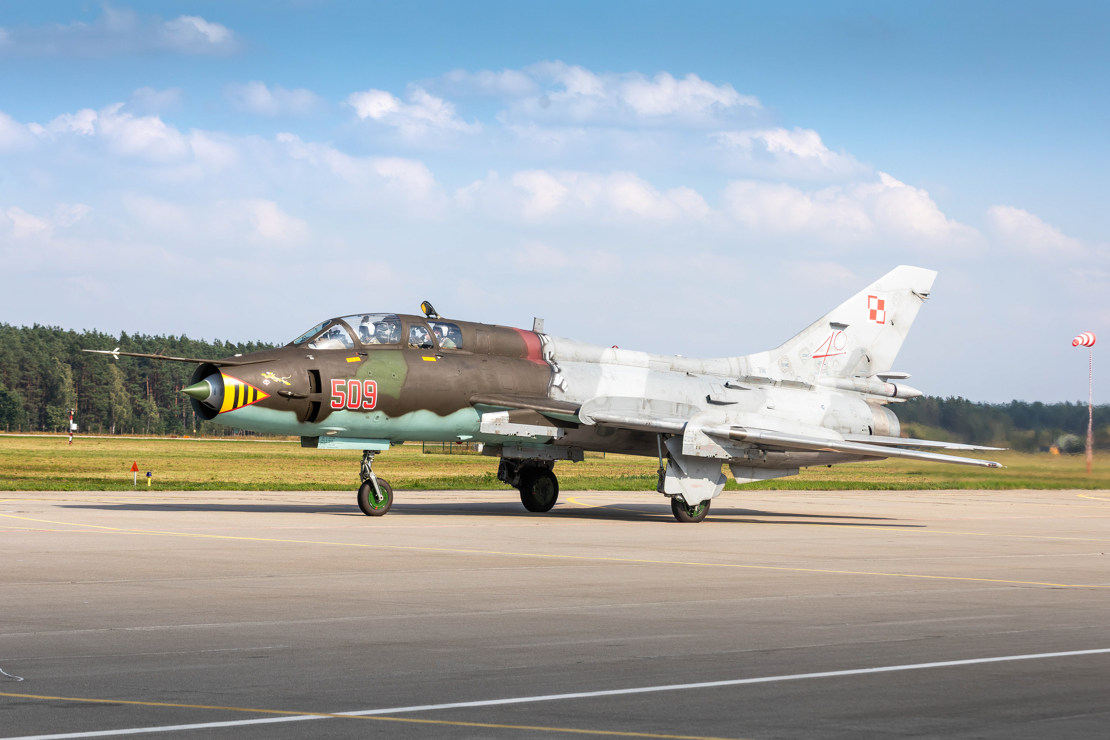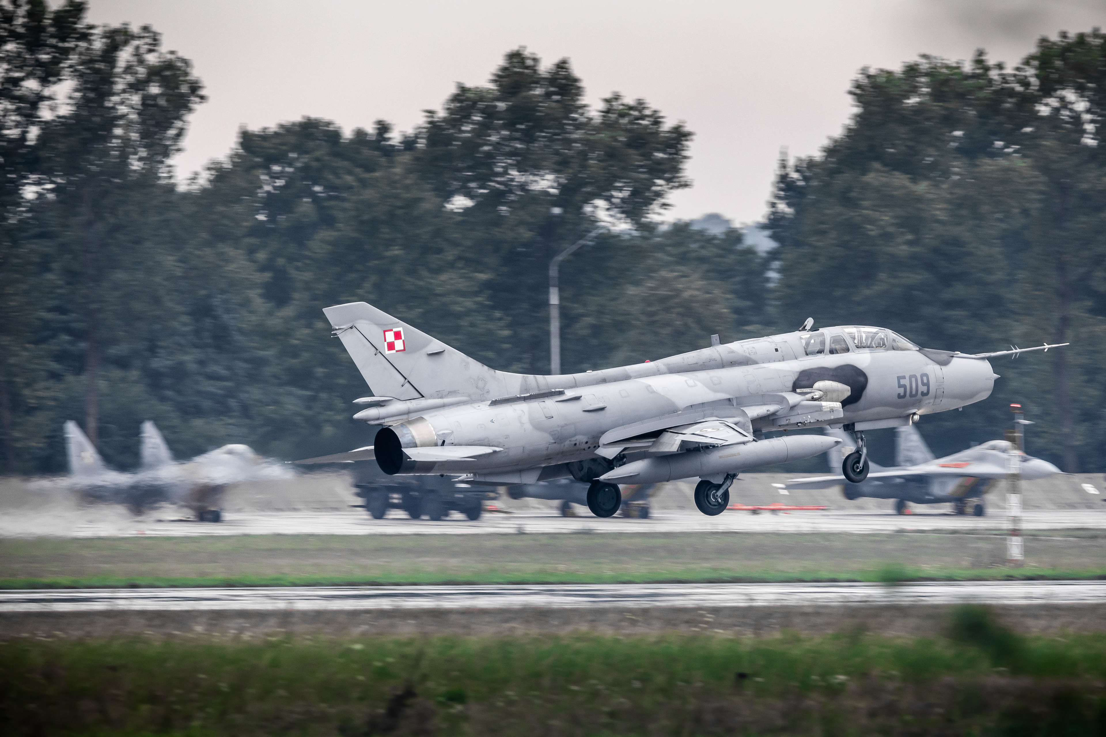 La famille Su-22 est la version export de la série soviétique Sukhoi Su‑17 à ailes à géométrie variable. En Pologne, les premières Su-20 furent introduites en 1974, suivies dans les années 1980 par les Su-22M4 (monoplace) et Su-22UM3K (biplace). La version M4 disposait du moteur Lyulka AL-21F-3, capable de pousser à Mach 1,7 environ, avec une capacité d’emport de l’ordre de 4 000 kg sur dix points d’ancrage.