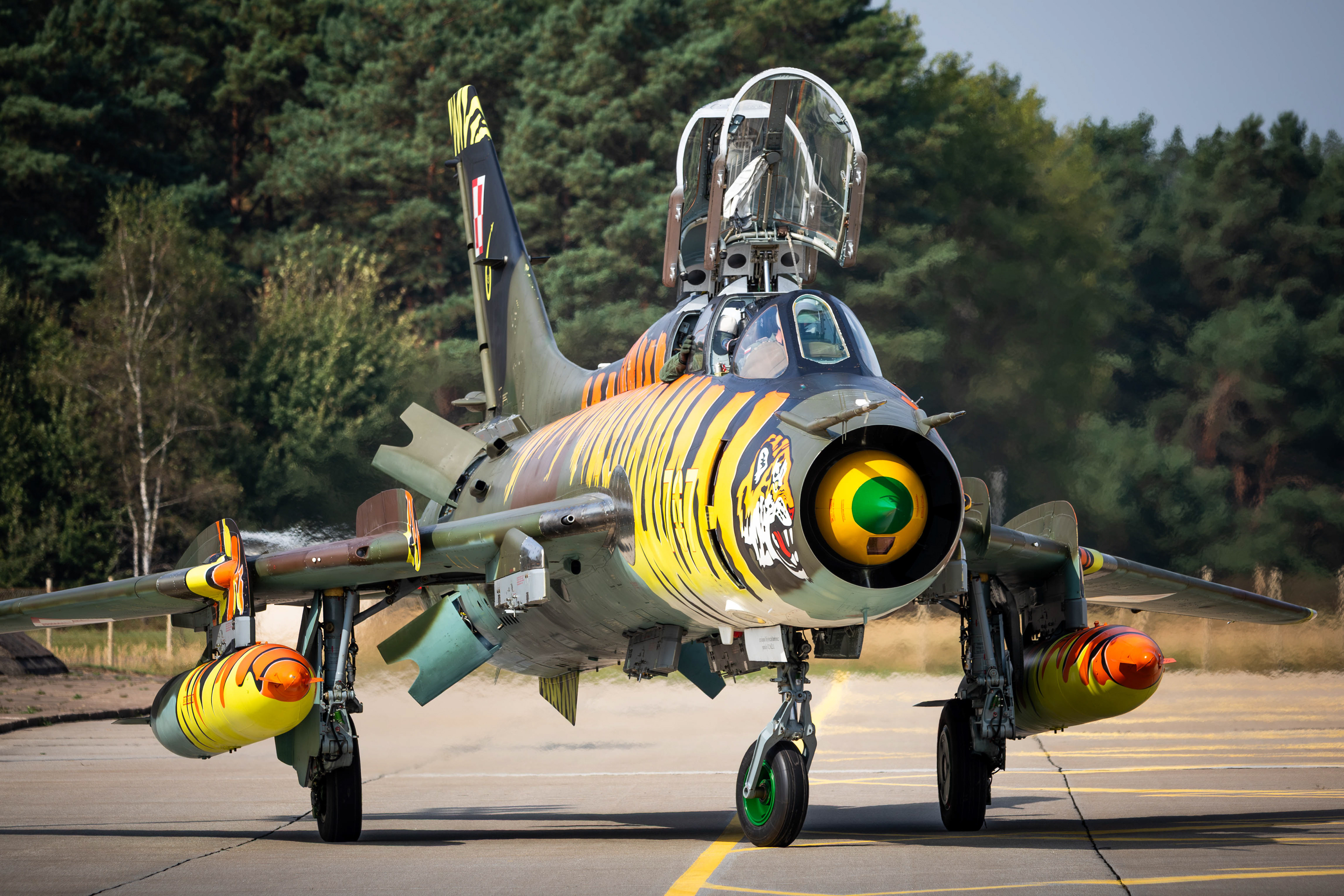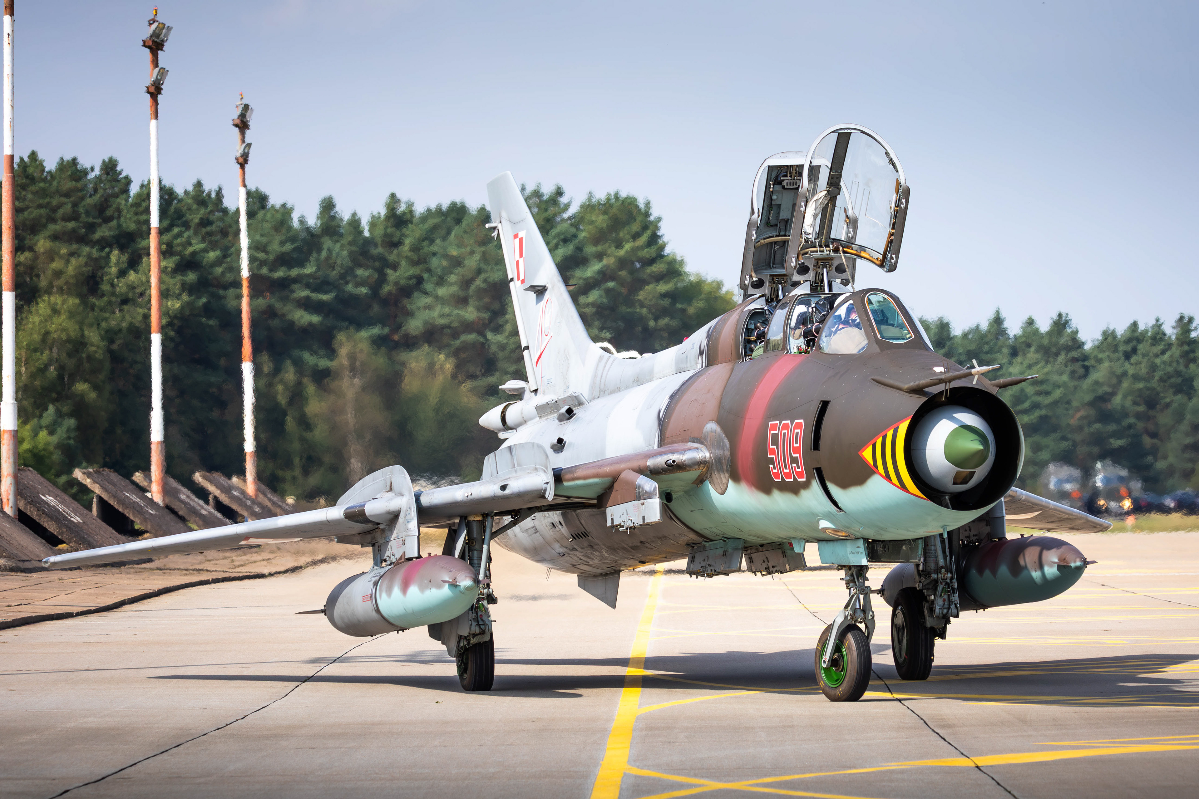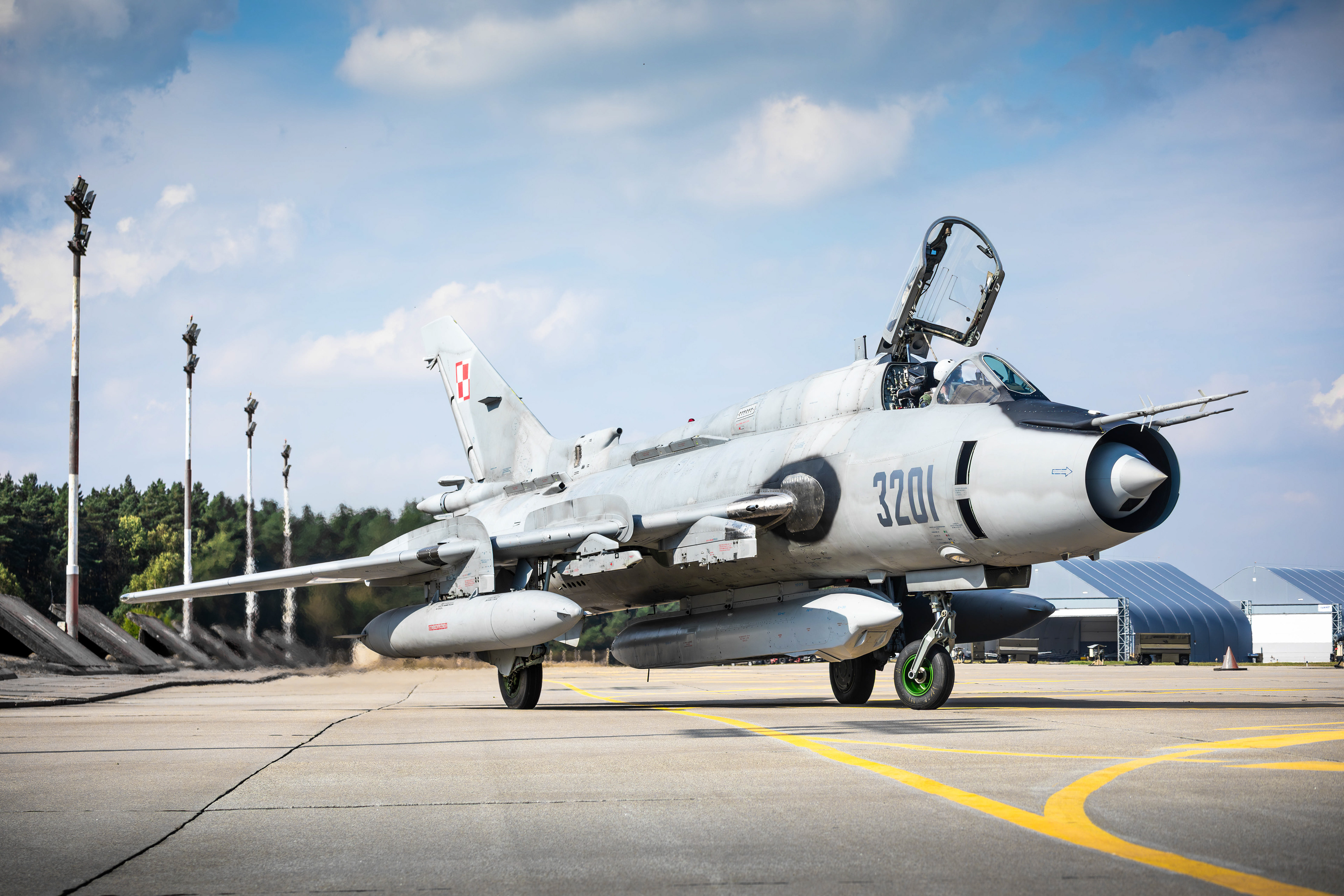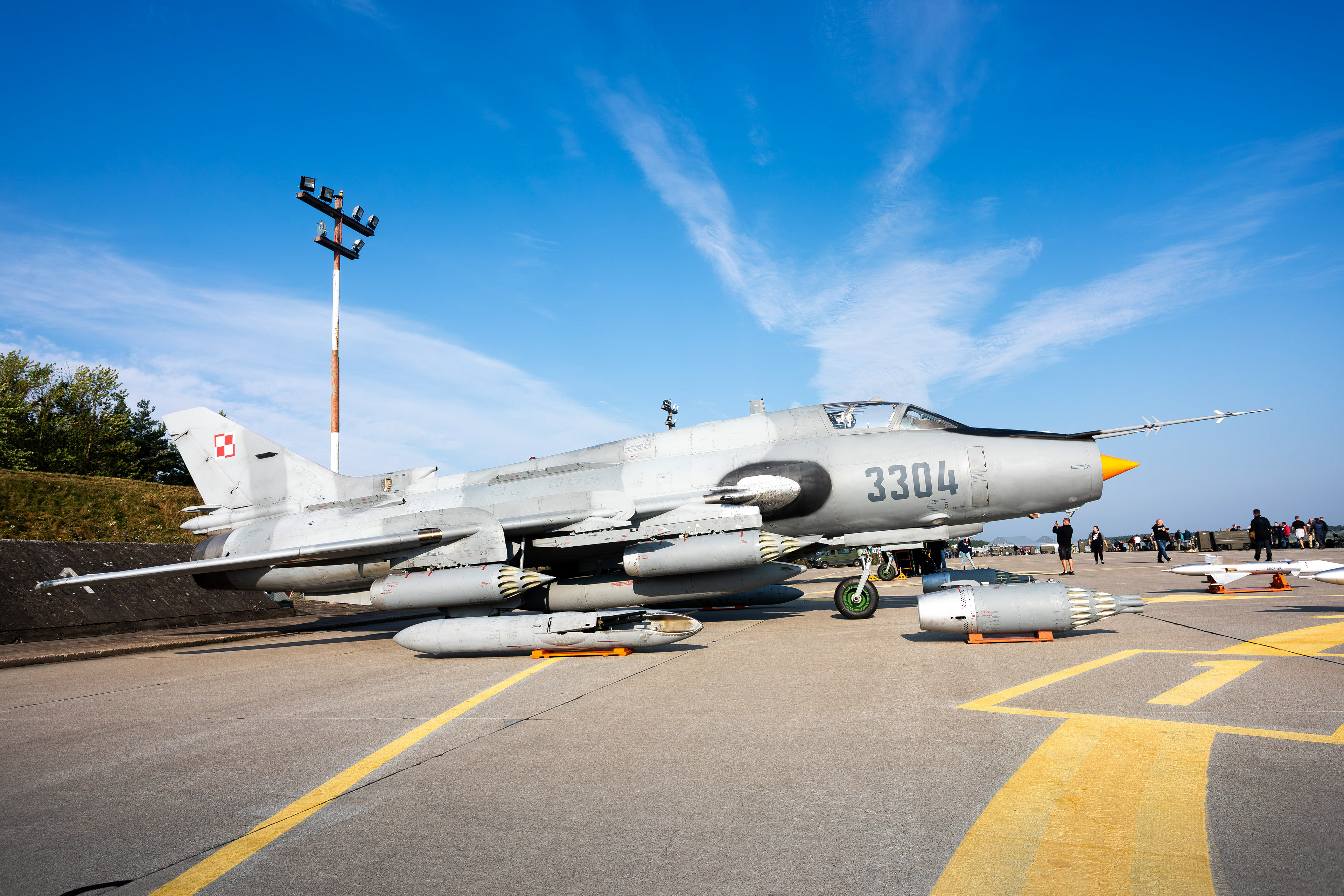 La famille Su-22 est la version export de la série soviétique Sukhoi Su‑17 à ailes à géométrie variable. En Pologne, les premières Su-20 furent introduites en 1974, suivies dans les années 1980 par les Su-22M4 (monoplace) et Su-22UM3K (biplace). La version M4 disposait du moteur Lyulka AL-21F-3, capable de pousser à Mach 1,7 environ, avec une capacité d’emport de l’ordre de 4 000 kg sur dix points d’ancrage.
