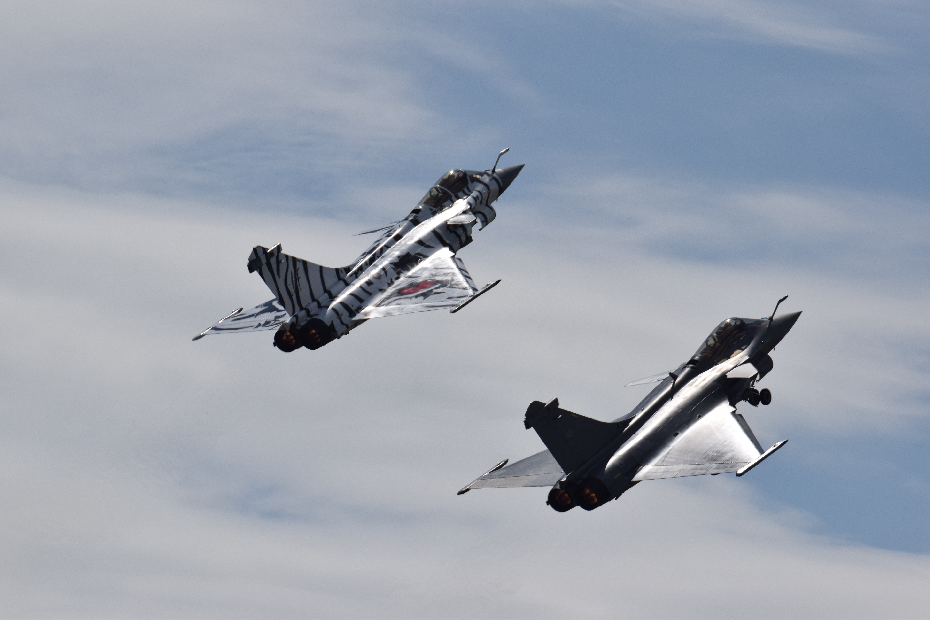 Le programme bascule ensuite vers l’histoire, avec le passage solennel de la Battle of Britain Memorial Flight : un Spitfire escortant le vénérable Lancaster, leurs moteurs Merlin et Rolls-Royce vrombissant à l’unisson au-dessus des spectateurs. Mais la suite annonce encore plus de décibels : le duo de Rafale M français, dont le superbe décoré à l'occasion du Tiger Meet, laissent derrière eux un sillage humide dans l’air chaud, avant que le Typhoon britannique ne vienne faire de même.