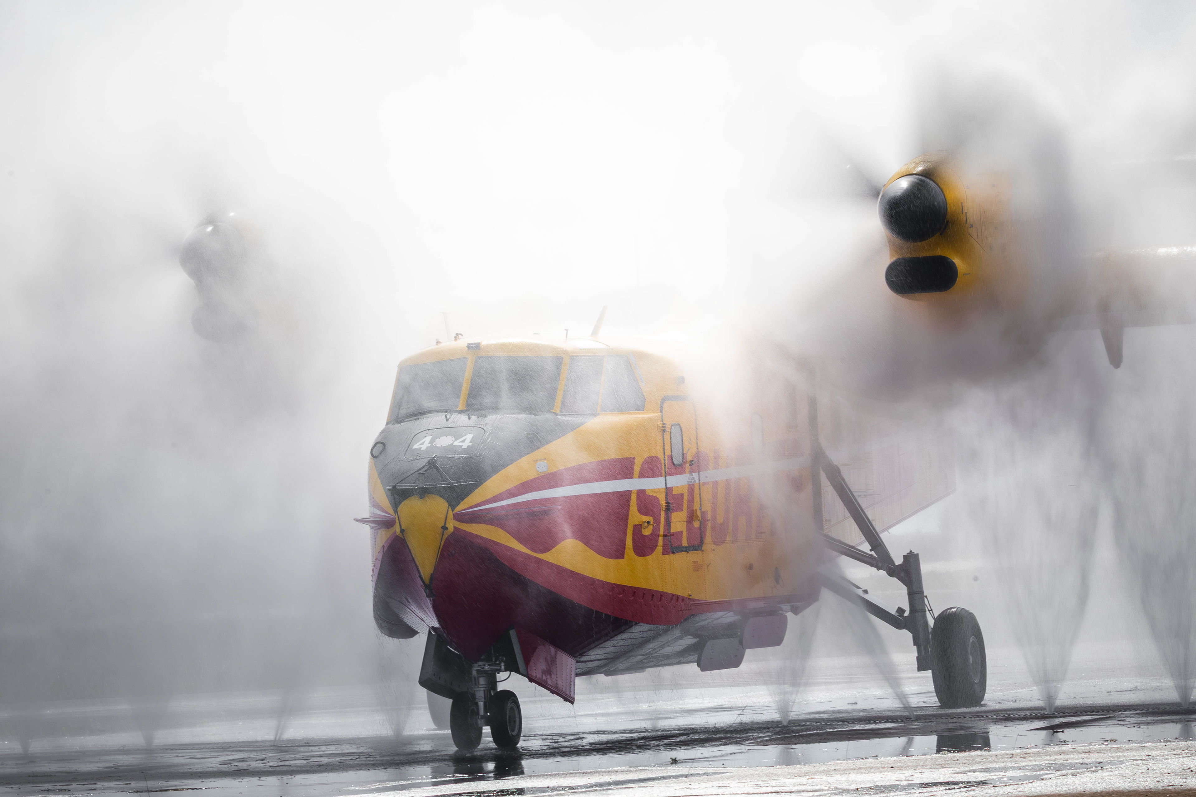 La Sécurité civile française est équipée de trois* Dash-8 Q400 en version bombardier d’eau, puisque cet avion est initialement destiné au transport de passagers.