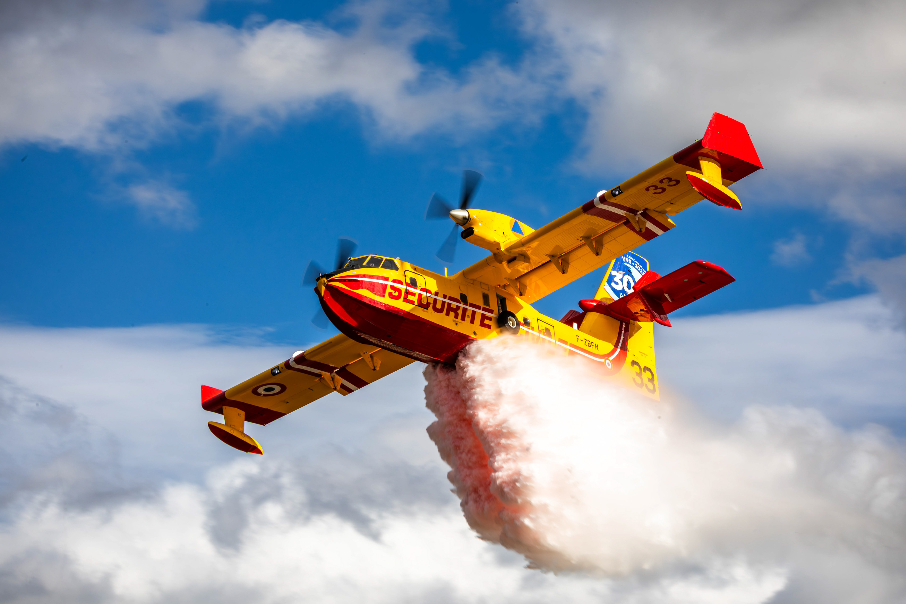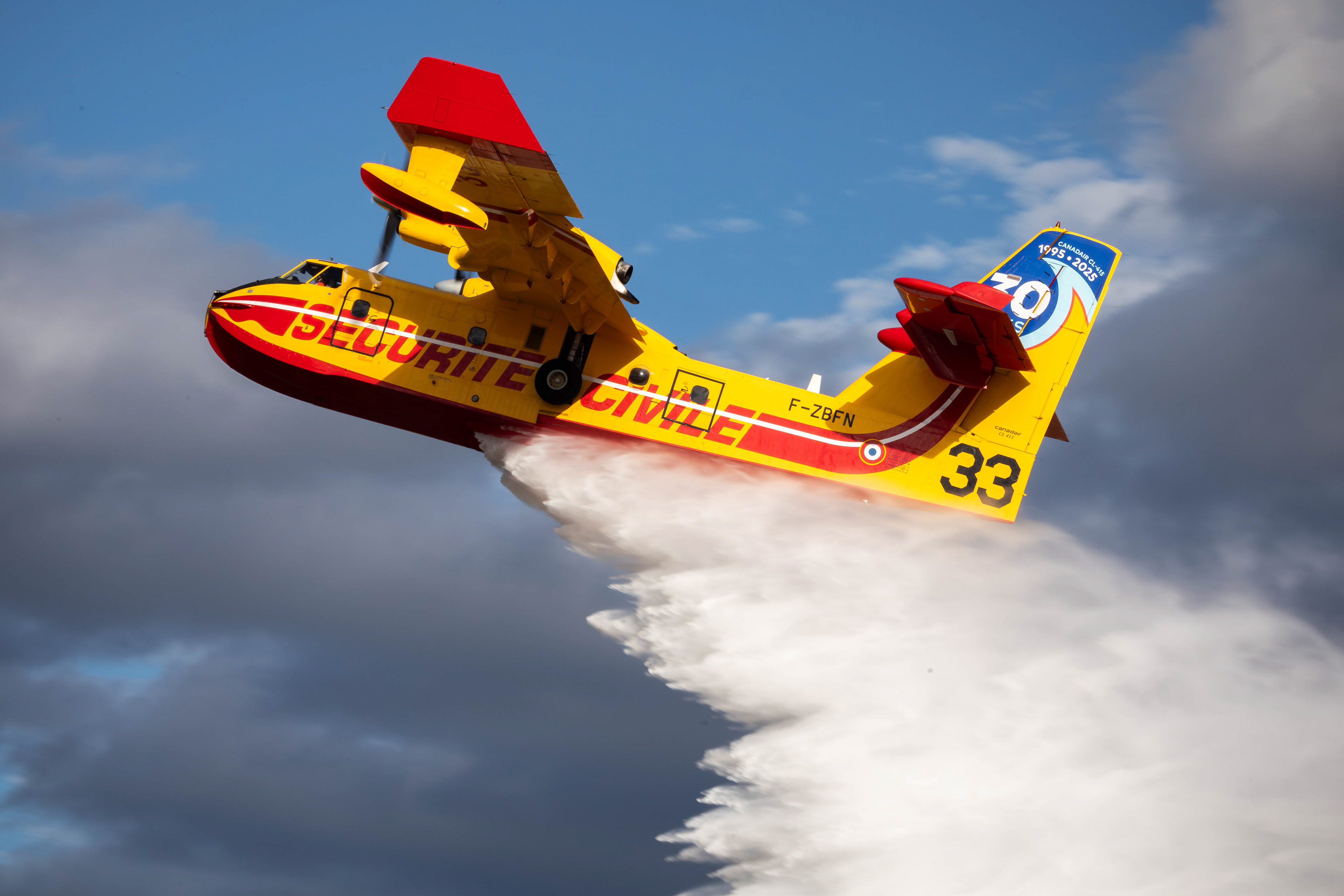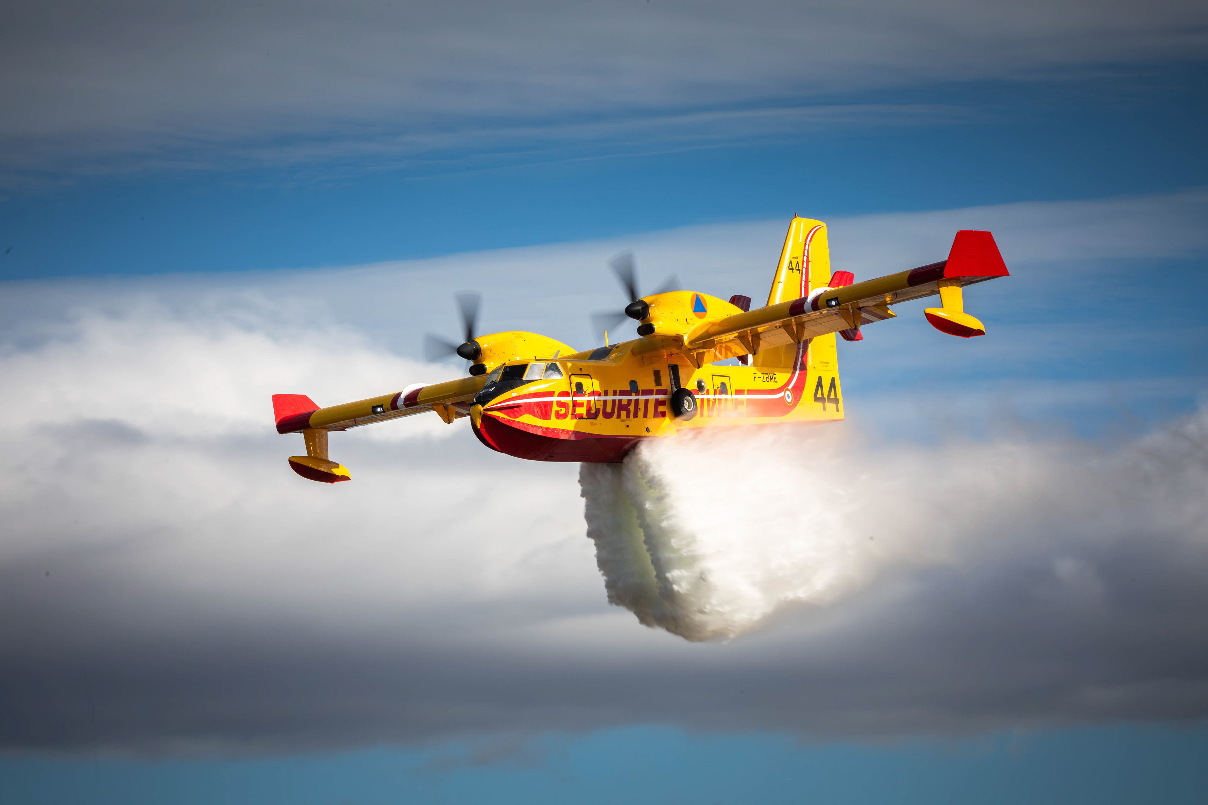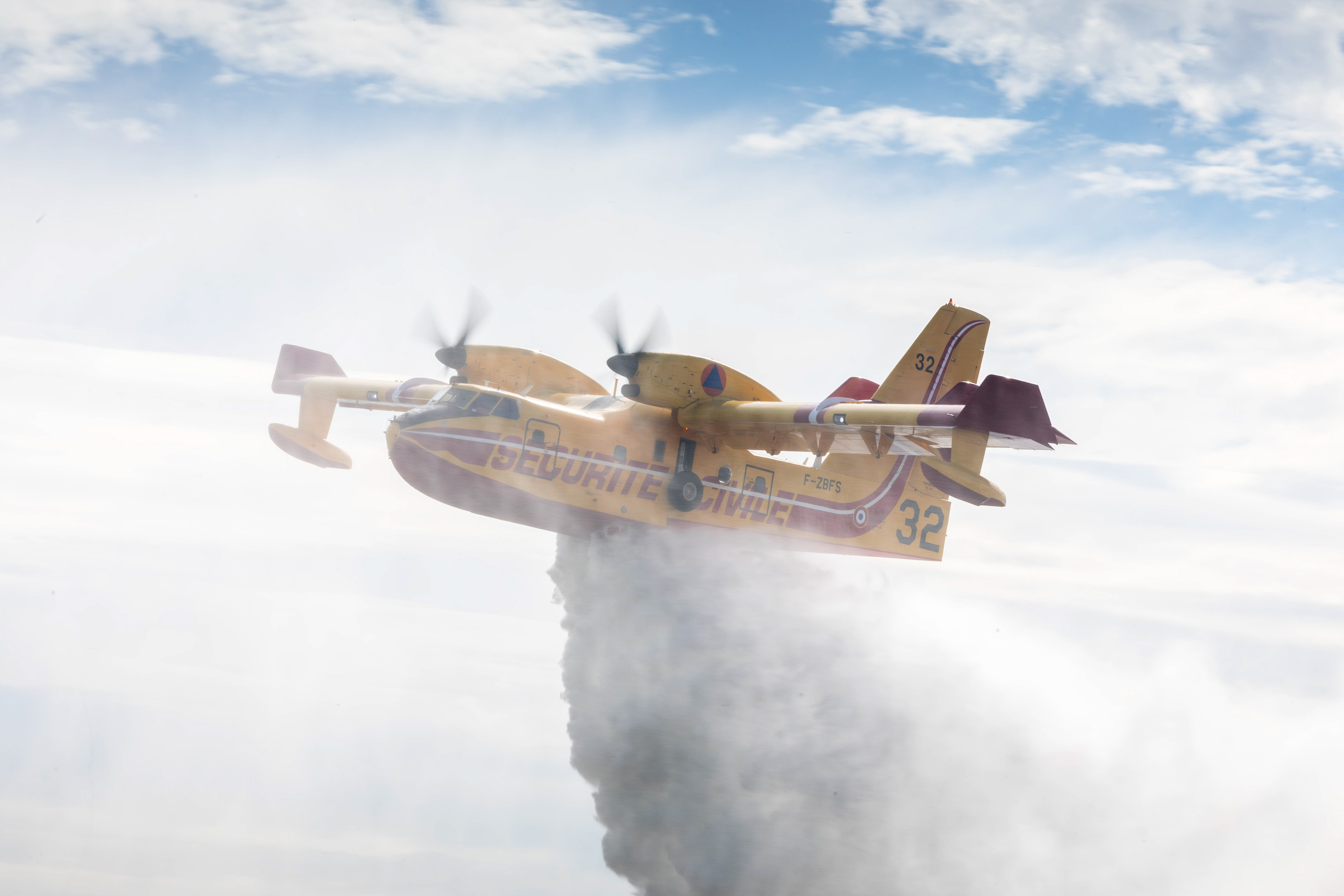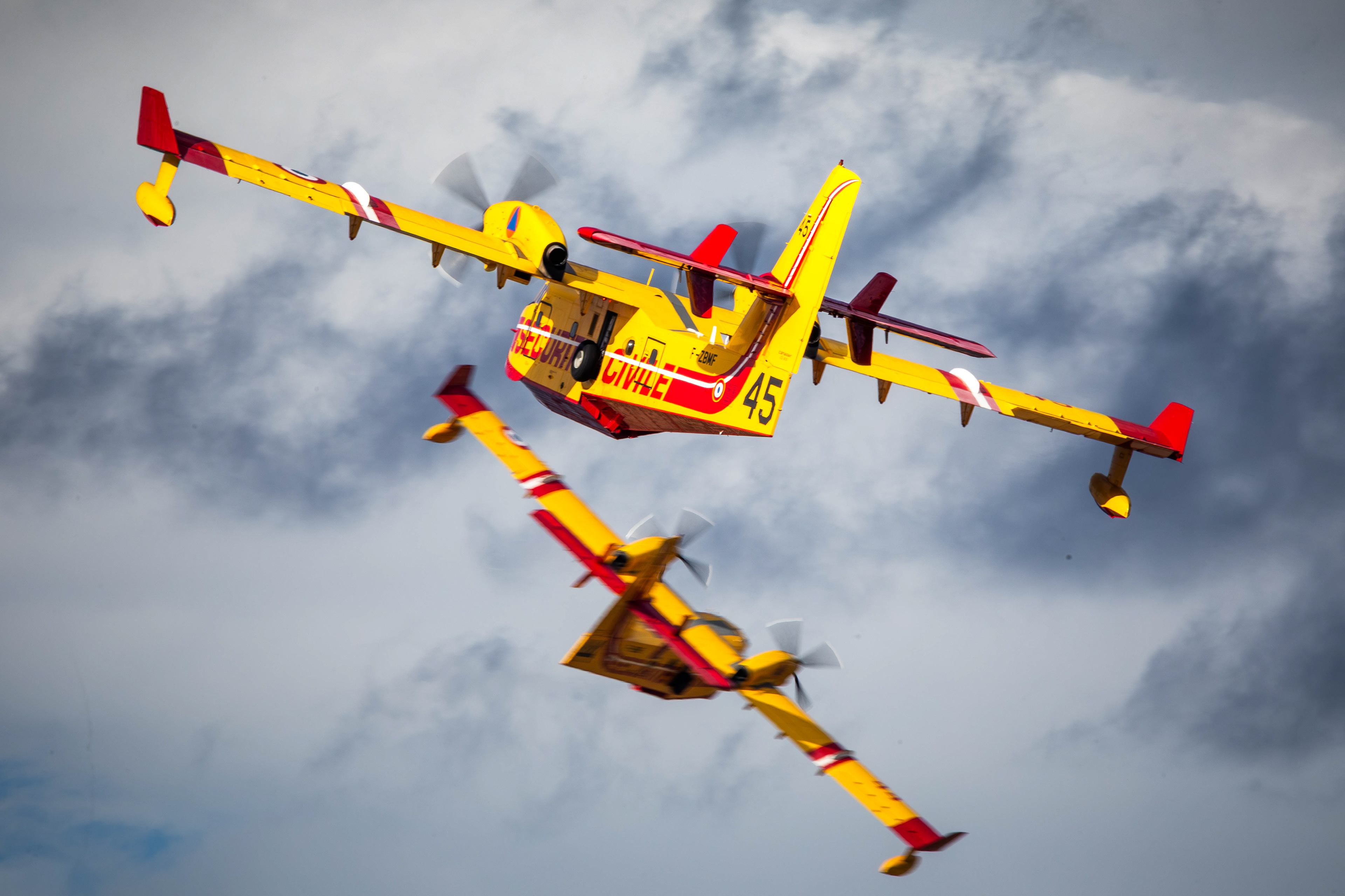 Facilement reconnaissable à ses couleurs jaune et rouge, le Canadair est le plus gros bombardier d’eau de la Sécurité civile française, qui en compte douze*, dont trois* sont basés en Corse, à Ajaccio. Depuis quelques années, le modèle CL-415 a remplacé le CL-215, qui était le premier avion conçu spécialement pour la lutte contre les incendies. Ses réservoirs peuvent contenir plus de 6.000 litres d’eau.